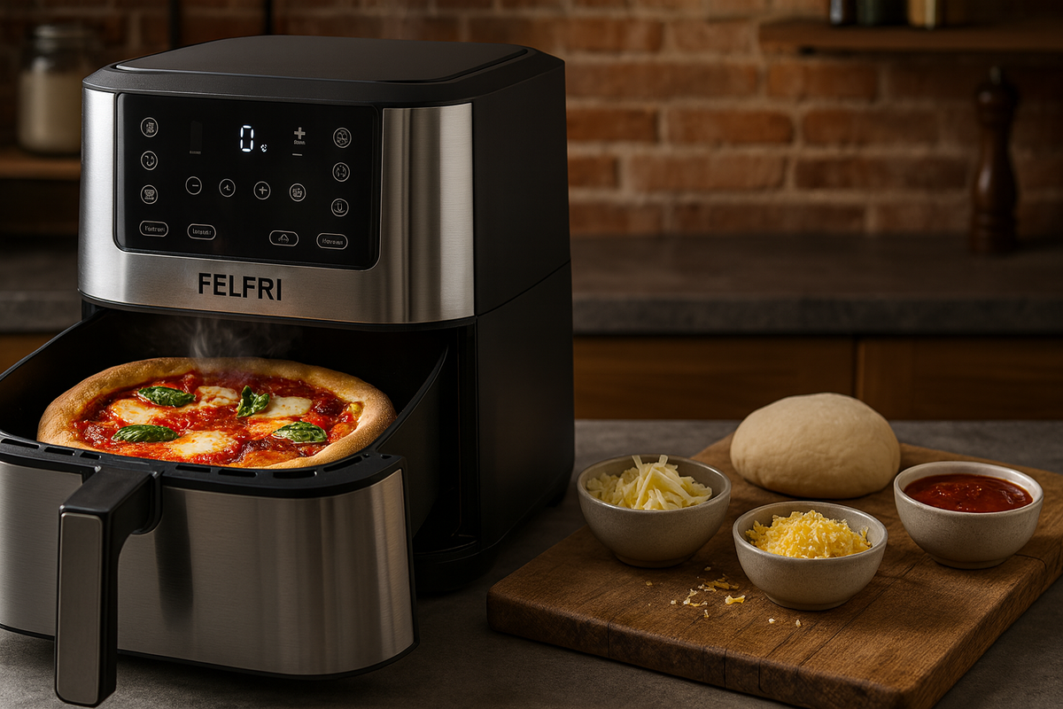 Модель FELFRI (артикул 4462347234) — это аэрогриль с мощностью 5,5 л и 1800 Вт. Оснащенный электронным управлением и несколькими автоматическими программами, он помогает приготовить пиццу с минимальными усилиями. Уникальные характеристики этого устройства обеспечивают чесночную корочку и обходятся без сложных манипуляций.