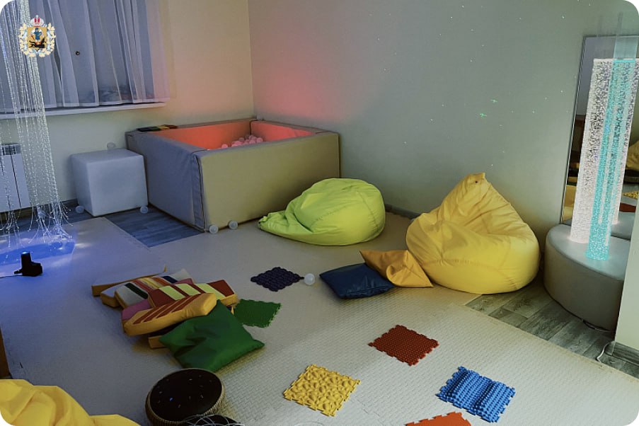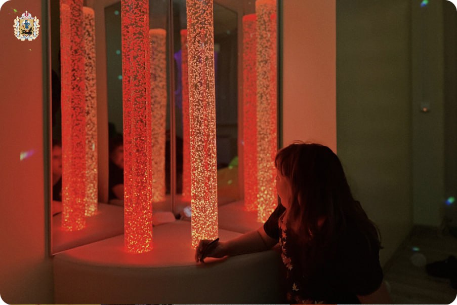 Комната оборудована пузырьковыми трубами, сухим бассейном с шариками, оптоволоконным «душем», музыкальными инструментами, проектором звездного неба и зонами для релаксации. Задача пространства – снижать стресс и эмоциональное напряжение, развивать внимание, моторику и когнитивные навыки у детей с ОВЗ.