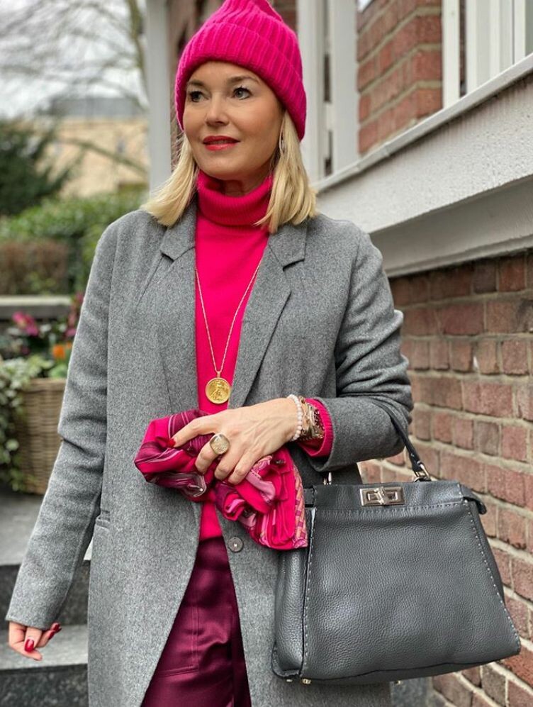 - Насыщенно-розовая вязаная шапка: Эта модель прекрасно подойдет как молодой моднице, так и стильной женщине за 50. Комбинировать ее стоит с ярко-розовой водолазкой и фиолетово-розовыми брюками, подчеркивая яркость жемчужно-серым пальто.