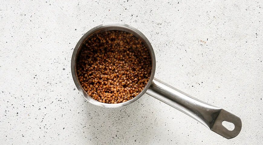 Сначала важно правильно подготовить основу. Для этого необходимо взять гречневую крупу и залить её 120 мл кипятка, заранее посолив. Доведите до кипения на сильном огне, затем накройте крышкой, убавьте огонь и дайте побулькать около 10 минут.