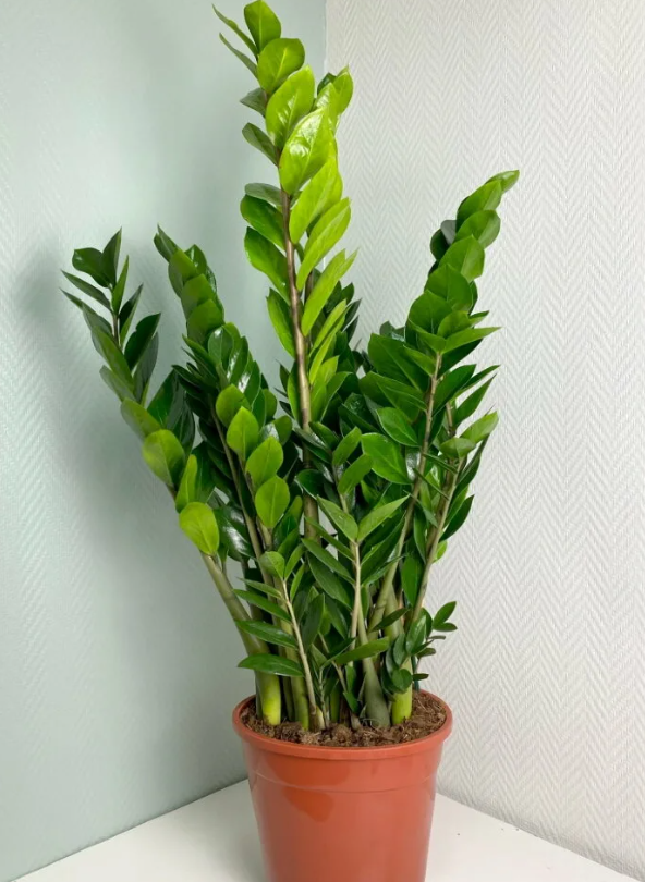 - Неприхотливость: Замиокулькас без проблем переносит низкое освещение и нерегулярный полив, а его глянцевые темно-зеленые листья излучают стиль и элегантность.