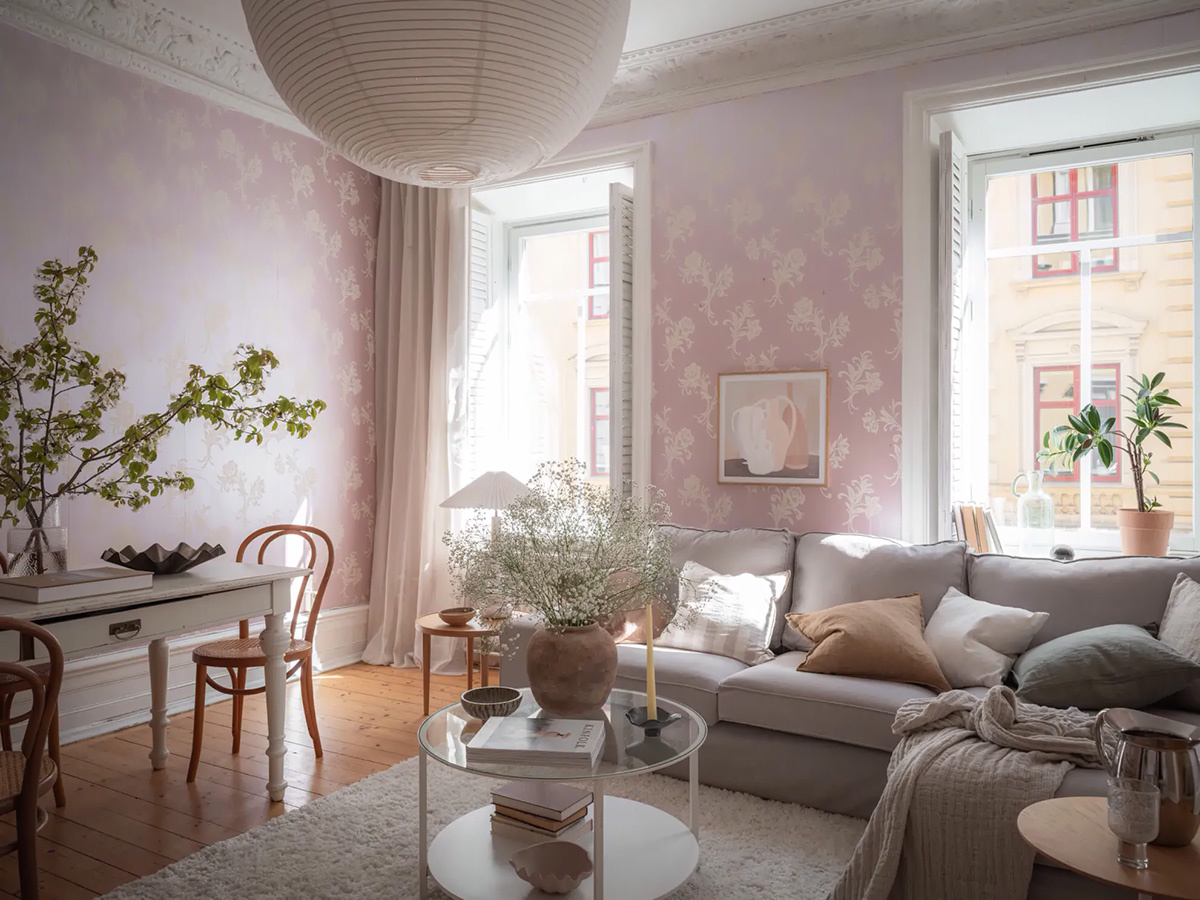 В данной шведской квартире с "женским" характером можно наблюдать гармоничное сочетание нежных пастельных оттенков и цветочных узоров. Это пространство вызывает ощущение уюта, где каждая деталь призвана создать атмосферу спокойствия и тепла. Розовые обои, наряду с текстильными элементами и естественным светом, придают общему дизайну легкость и воздушность, превращая дом в уютное убежище.