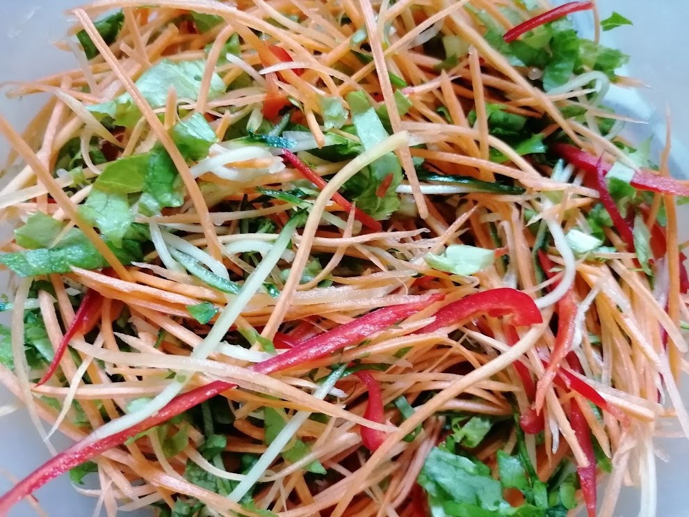 Для достижения нужной текстуры овощи нарезаются по особому принципу: морковь – тонкой соломкой или натирается, огурец и перец – полосками. Листья салата стоит рвать руками, чтобы сохранить их лёгкость. В блендере готовят заправку, комбинируя кусок моркови, имбирь, лук, соевый соус, уксус, масло и мёд. Все ингредиенты взбиваются до однородной массы, при необходимости добавляется соль или ещё немного мёда для улучшения вкуса.