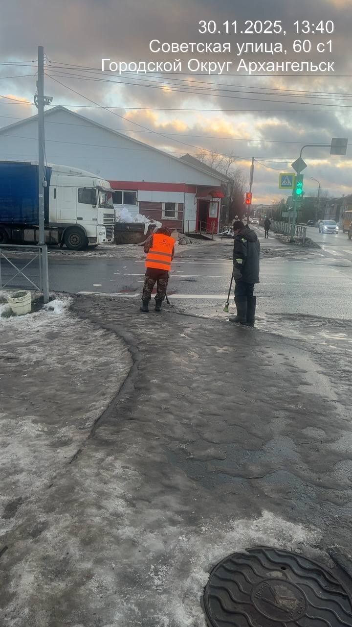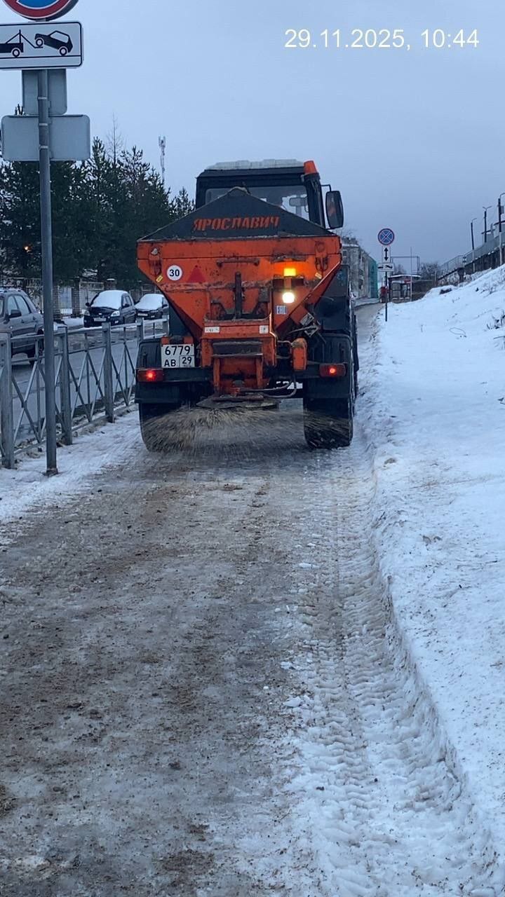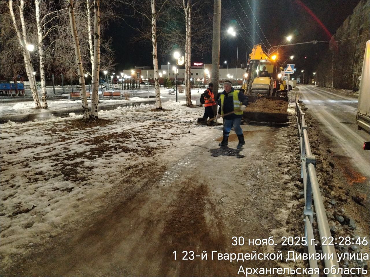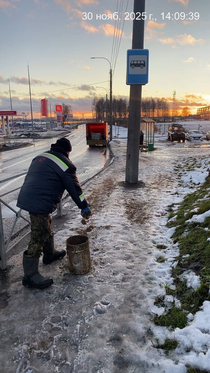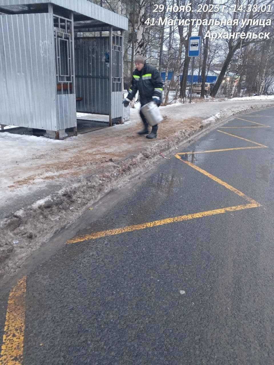 Третьи сутки силы подрядчика сосредоточены на борьбе с гололедом и скользскостью на проезжей части и тротуарах. Особое внимание уделяется очистке и посыпке песком остановок общественного транспорта и пешеходных переходов.