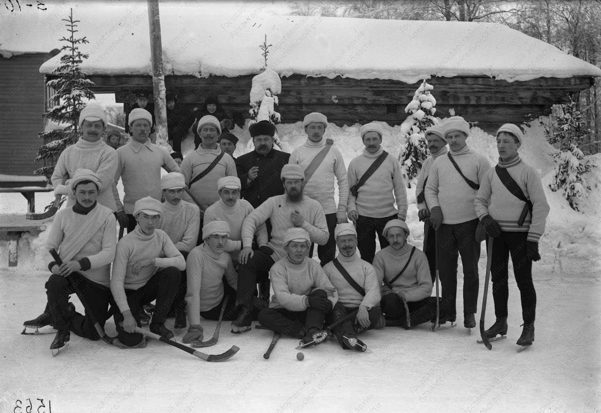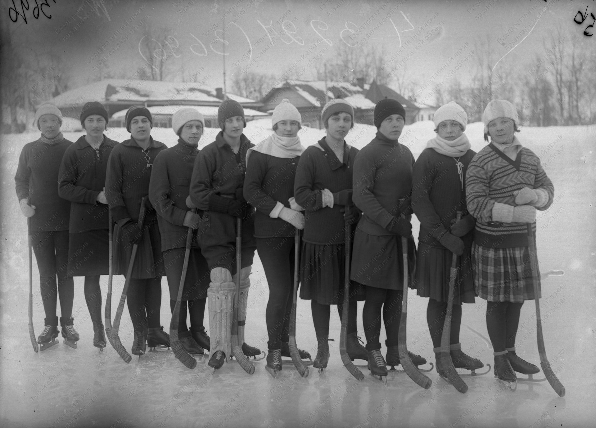 На первой фотографии архангельские хоккеисты в 1913 году. Кадр сделан П.Н. Рыбниковым. А на втором снимке — Хоккейная женская команда Совработников. 1929 год. Фото Аренсона.