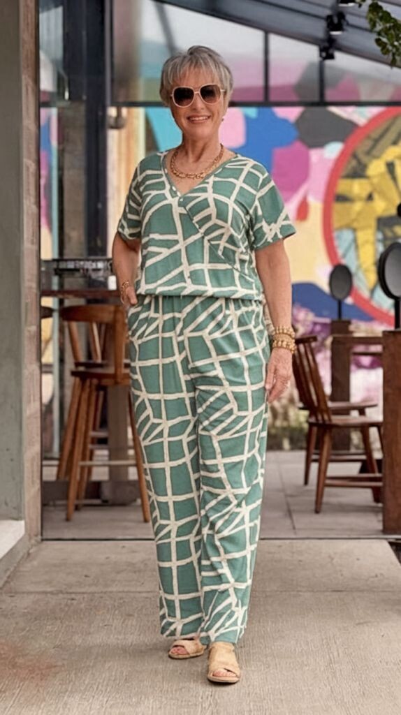 - Легкий брючный костюм: идеален для летнего сезона. Рекомендуется выбирать костюмы с ненавязчивыми принтами. Пусть брюки будут свободного кроя, а блузка – на запах, что добавляет женственности и комфортности.