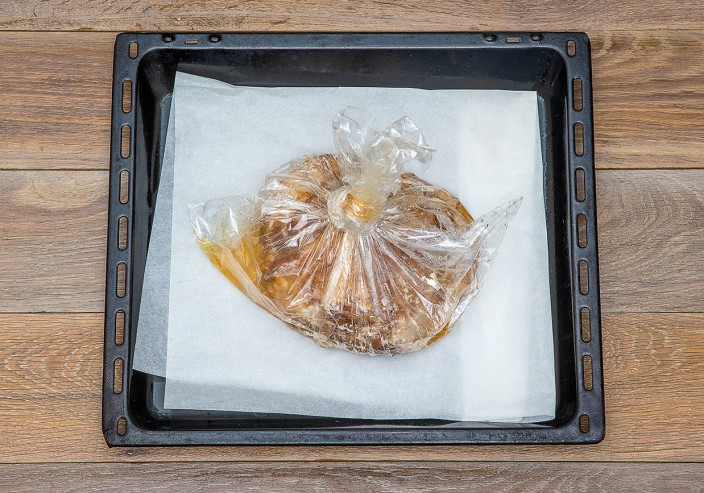 Шаг 1: Начните с разогрева духовки до 130°С. Доставайте свинину из упаковки и аккуратно промокните её салфеткой, чтобы убрать излишки маринада. Добавьте немного соли и переложите мясо в пакет для запекания, плотно завязав его. Выложите свинину на противень, предварительно застеленный пергаментом, и отправьте в разогретую духовку на 40 минут.