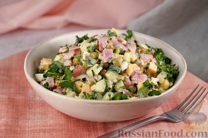 - Ветчина с огурцами и горошком — классическое сочетание, где нежная ветчина, хрустящие огурцы и сладкий зеленый горошек создают неповторимый вкус. Этот салат идеально подойдет для быстрого перекуса или в качестве закуски на праздничный стол. Заправленный сметанным соусом с добавлением горчицы, он порадует всех за столом.