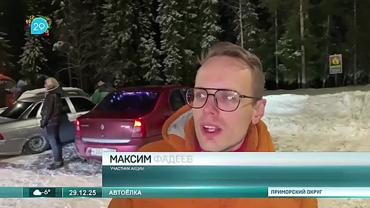 На лыжном стадионе в Малых Карелах прошёл необычный флешмоб для автомобилистов — «Автоёлка». Более 200 машин выстроились в форме одного из главных символов Нового года. Десятки огней превратили парковку в сказочное пространство.