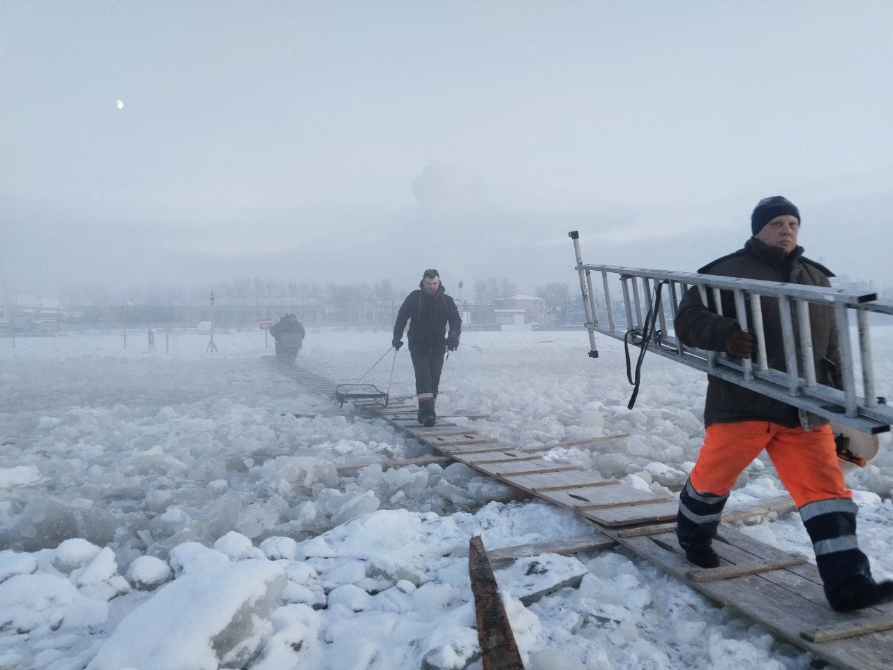 Сегодня состоялось комиссионное обследование. Толщина льда соответствует требованиям безопасности, переправа оборудована и открыта. Буксирное сообщение с островом прекращено.