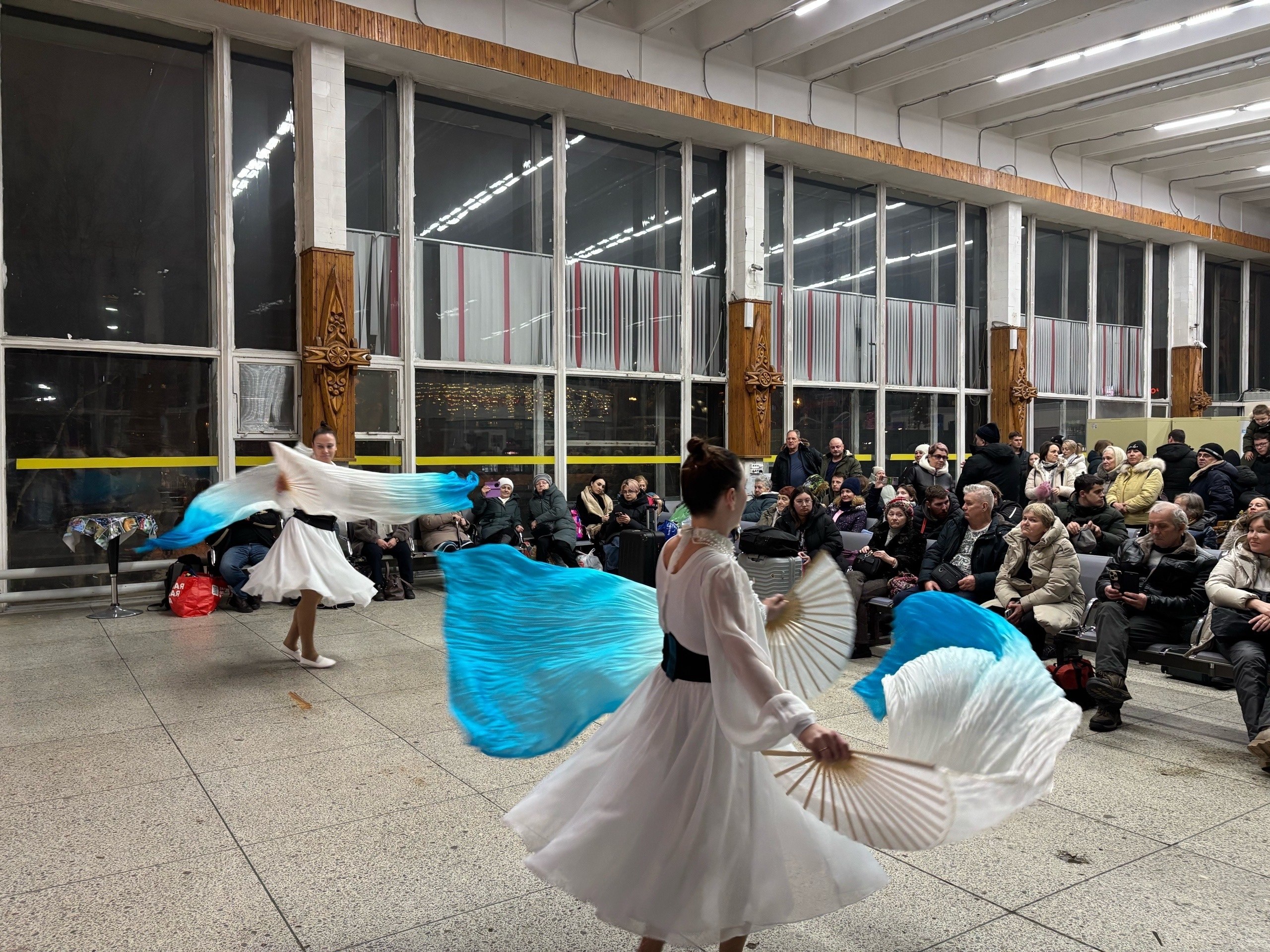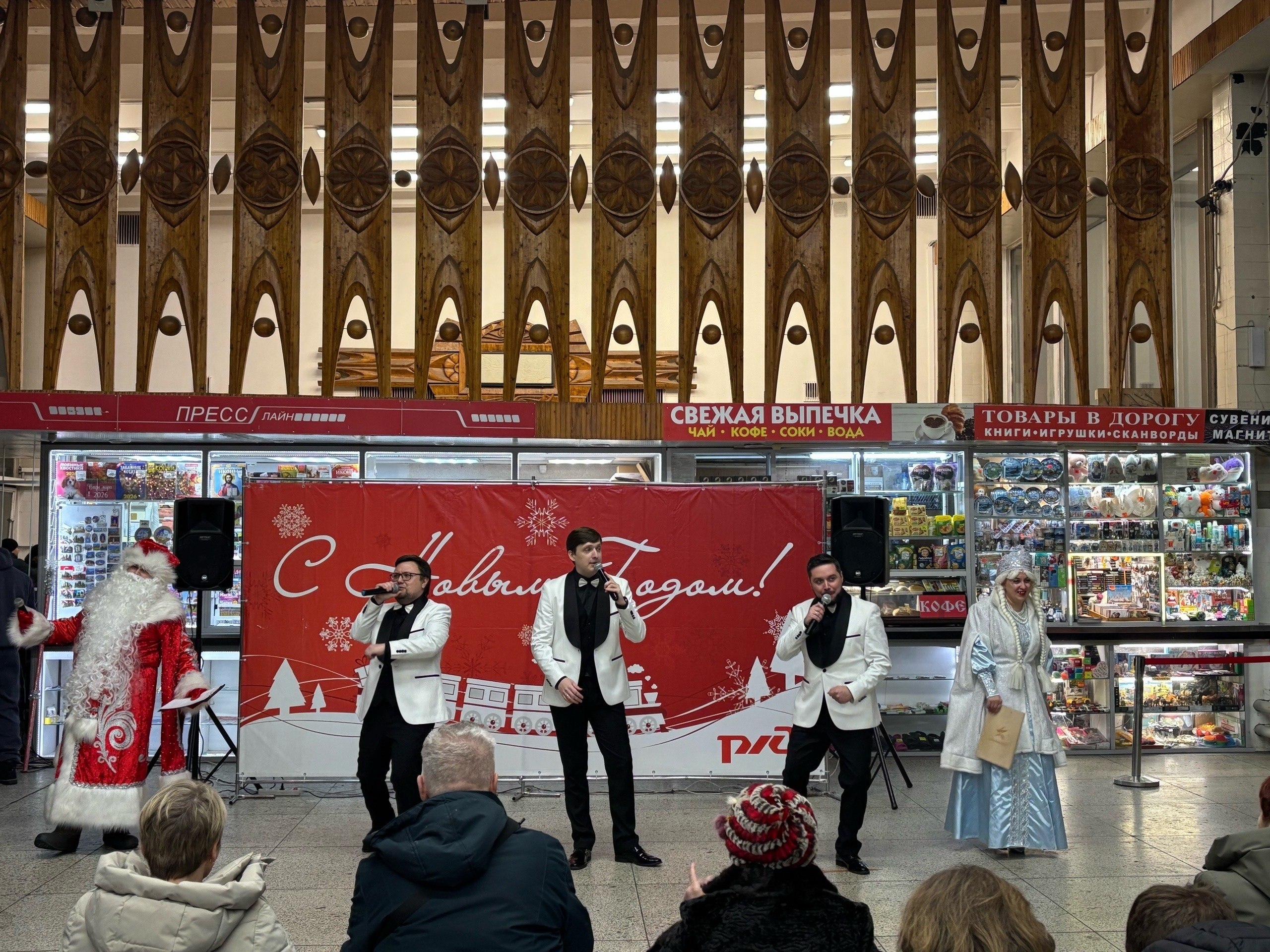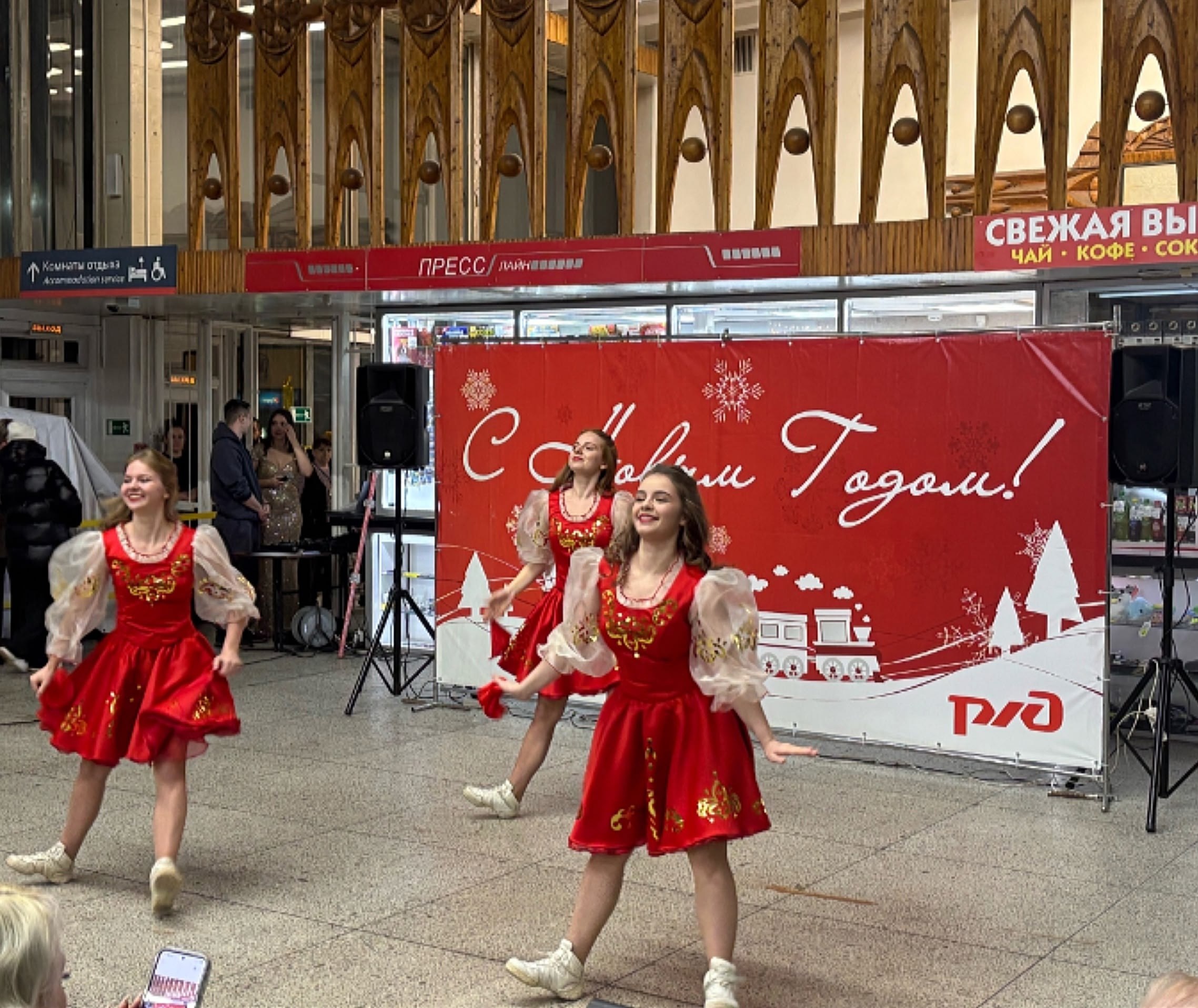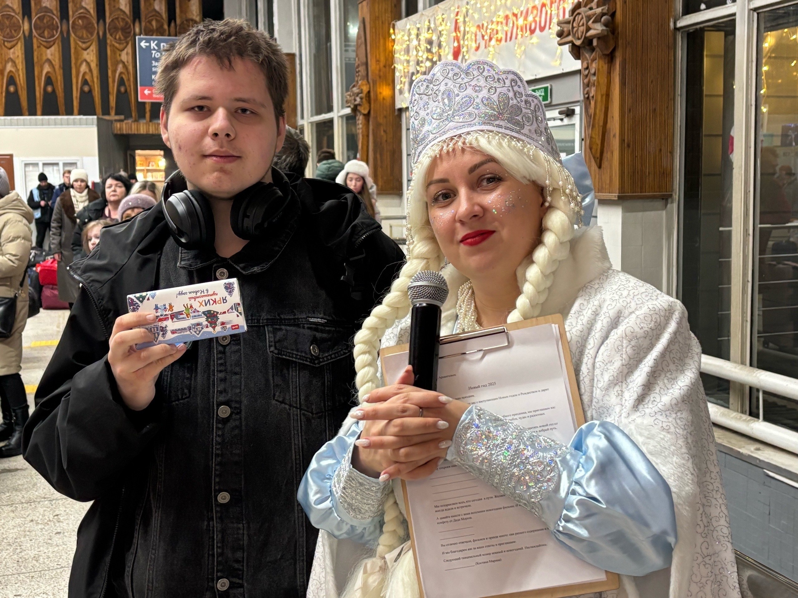 В преддверии Нового года на вокзале Архангельск пассажиров ждал настоящий праздник! Железнодорожники устроили для всех концертную программу с песнями и танцами, а Дед Мороз и Снегурочка подарили сладости.