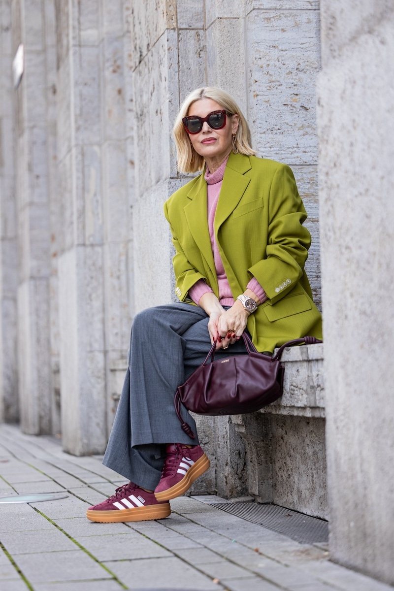 Блогерша активно использует тренды смарт-кэжуал и спорт-шик. Её повседневные образы из брючного костюма фисташкового цвета, нарядной блузки и белых кроссовок с темно-зеленой кожаной сумкой через плечо подчеркивают современный взгляд на моду для женщин 50+.
