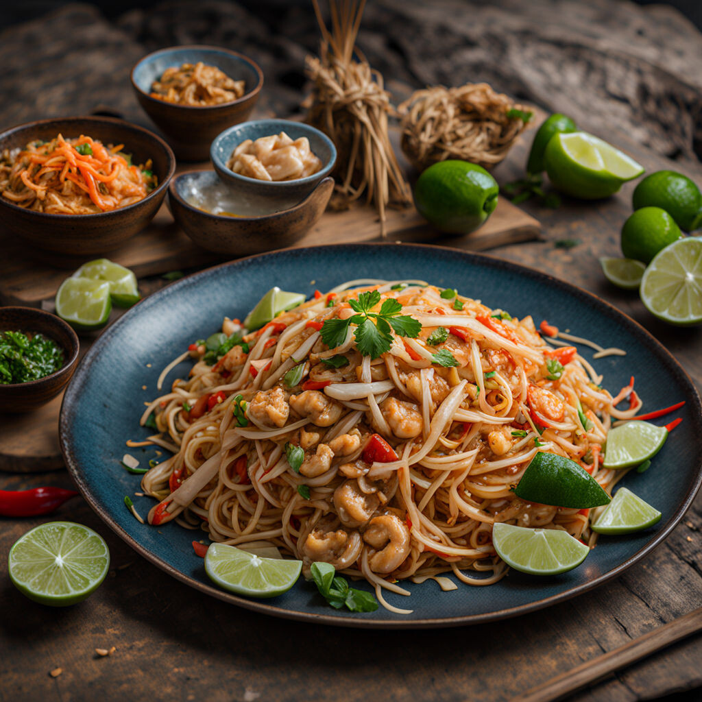 - Приготовление: Замочите лапшу, обжарьте чеснок, добавьте креветки и яйца, потом перемешайте с лапшой и соусом. Подавайте с лаймом и арахисом.