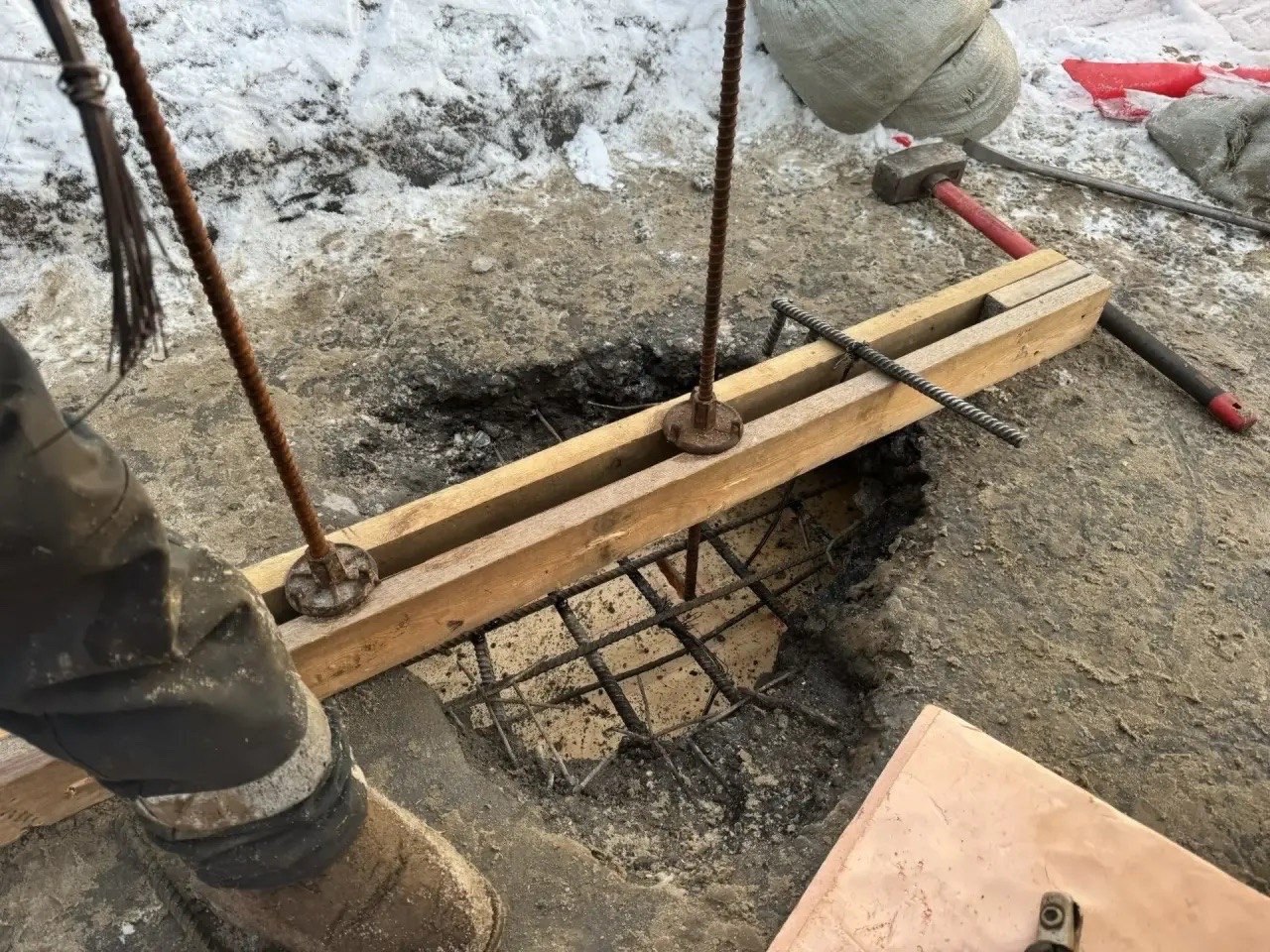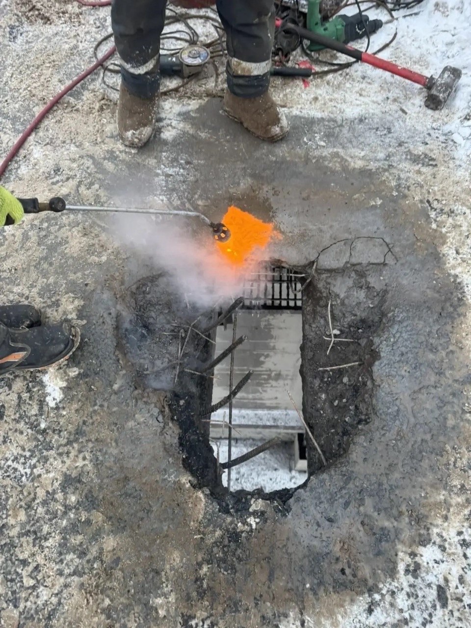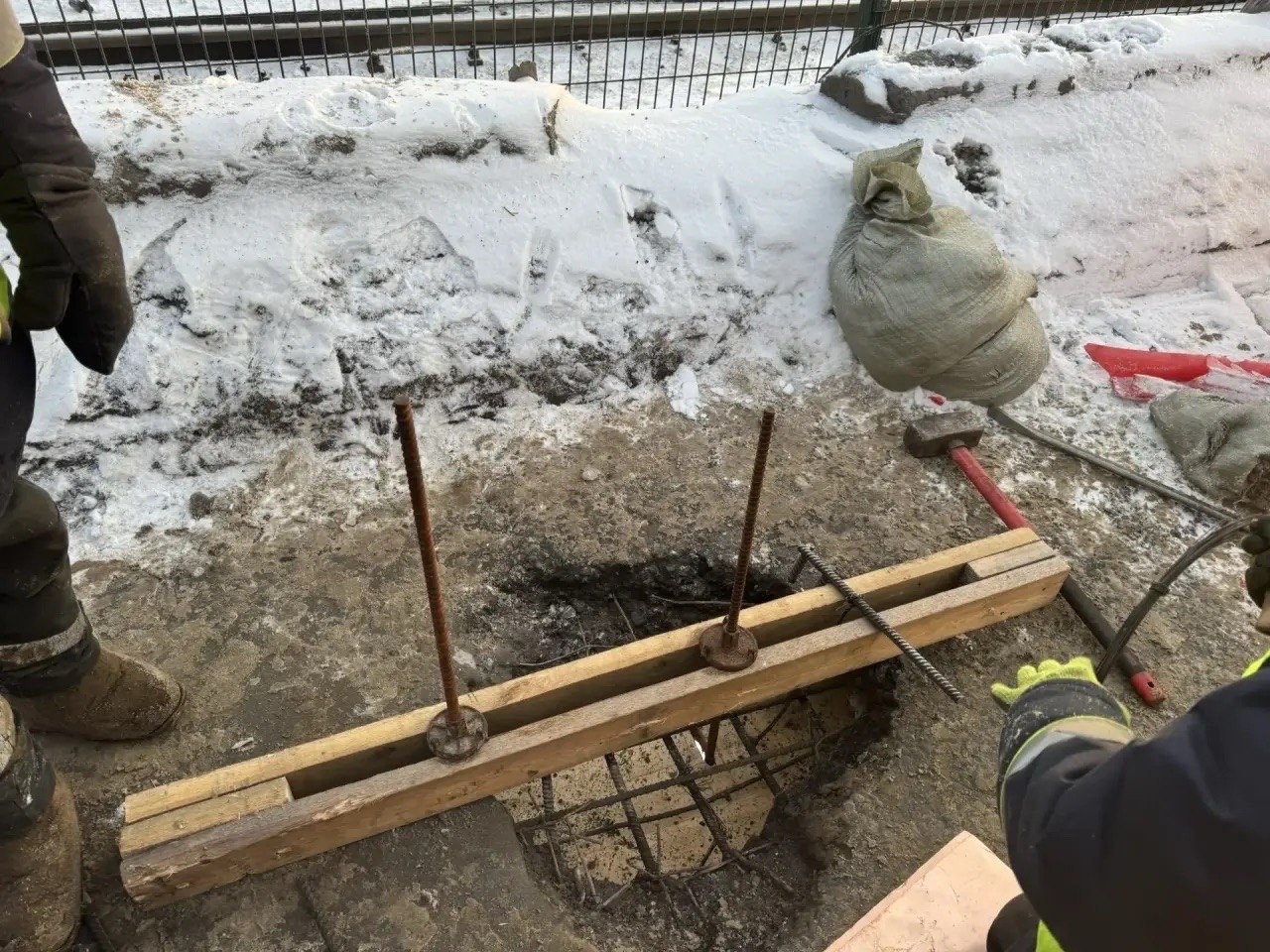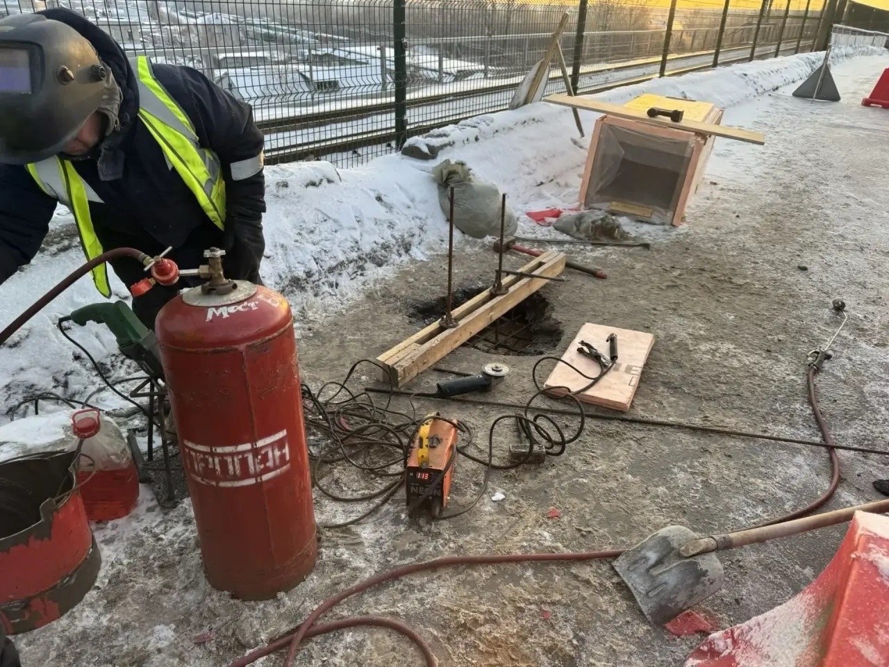 По словам специалистов, морозная погода не помешает - участок прогревают тепловыми пушками, укрепляют металлическим щитом. Далее зальют бетоном и уложат верхнее покрытие.