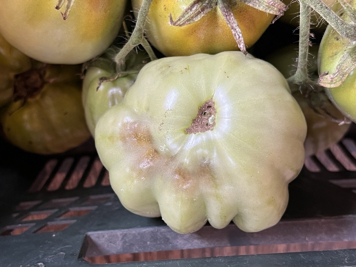 - Плоды: томаты покрываются буроватыми пятнами, становясь твердыми и неспособными к дозреванию.