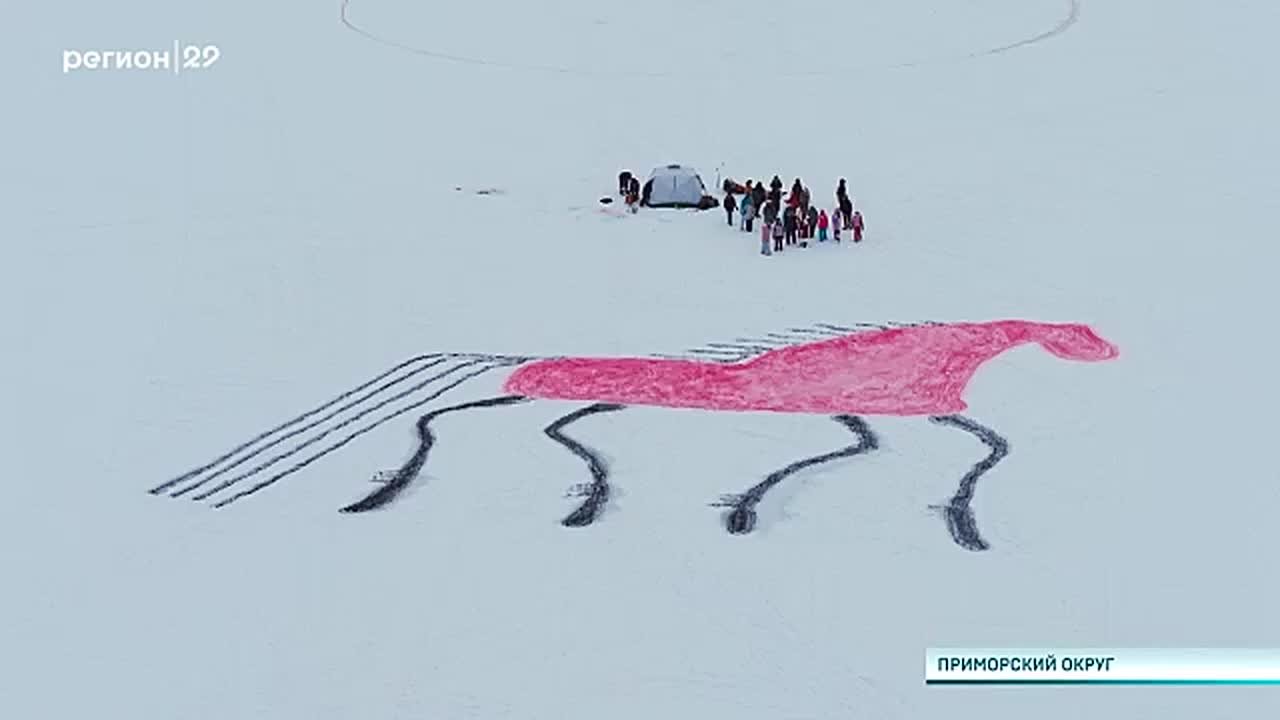На озере Лахта в Катунино появилось изображение «мезенского» коня с гигантской, более 100 метров, надписью «Мы любим Север». Чтобы создать такое признание в любви родному краю потребовались не только десятки рук и ног, но и светлые головы геодезистов.