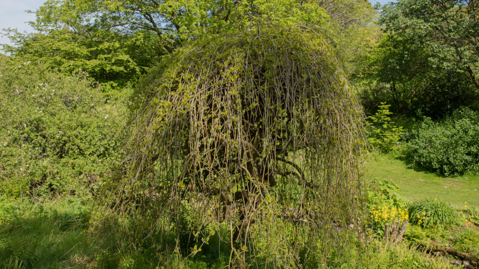 Шелковица (Morus) относится к семейству Тутовых. Плакучая разновидность – это специально сформированное дерево, высота которого обычно не превышает 2–3 метров при ширине до 1.5–2 метров. Ветви свисают вниз, превращая дерево в зеленое облако, которое украсит любой пейзаж, особенно в осенний период с красивыми изгибами. Этот вид может плодоносить до 500 лет, а ягоды достигают длины 4 см и созревают в середине лета.