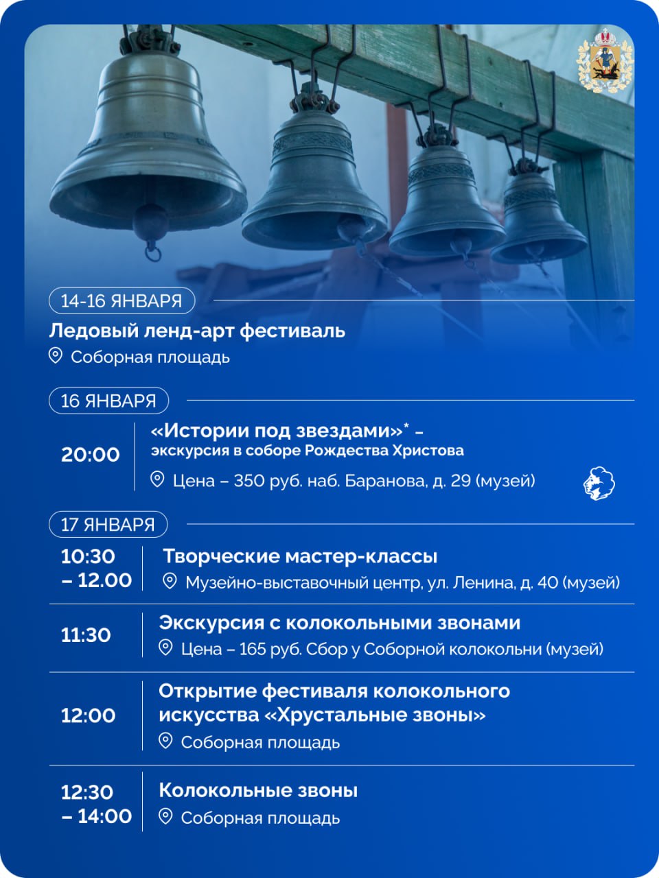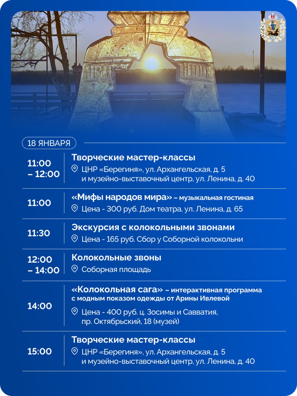 Город вновь наполнится мелодичным перезвоном. Событие, ставшее визитной карточкой зимнего Поморья, даст старт празднованию 880-летия поселения. Мероприятие станет одним из значимых событий Года культуры Русского Севера, объявленного губернатором.