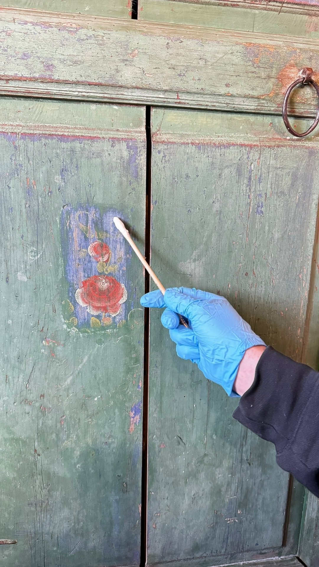 Эти двери оказались с «сюрпризом». Реставраторы готовились работать только с изображением на лицевой стороне. Но очистив краску на тыльной стороне, обнаружили ещё один букет нарисованных роз. Как сообщают в парке, двусторонняя роспись — привычное явление на Кенозере.