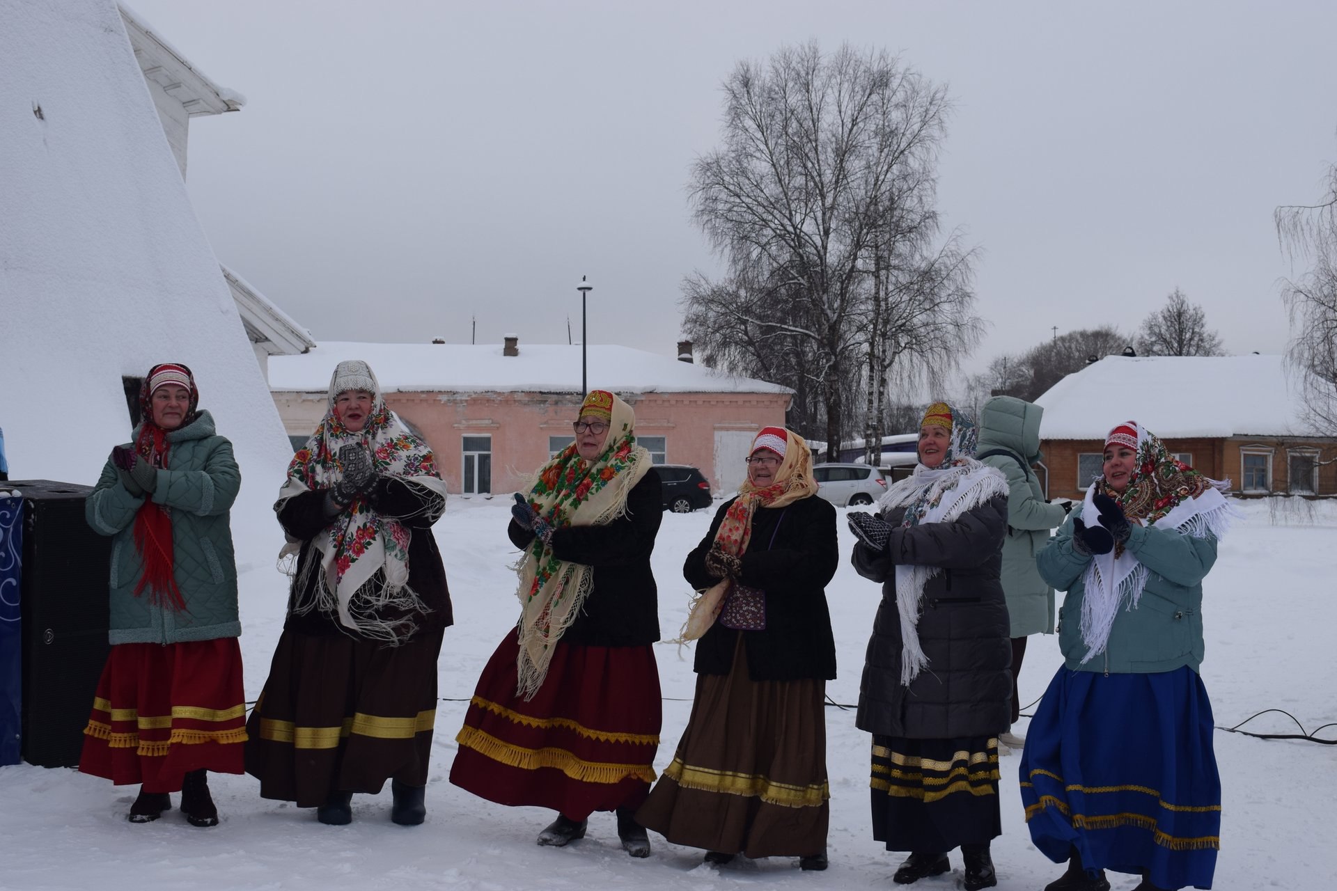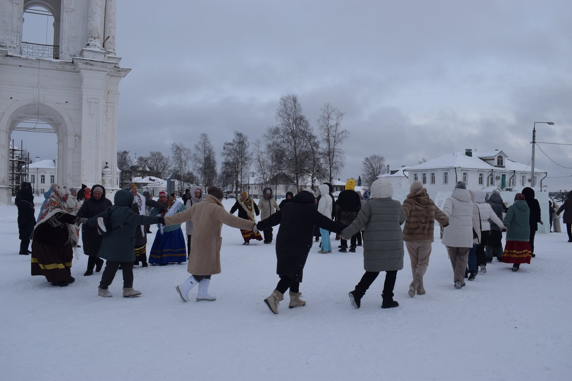 Морозный воздух наполнился не только праздничным предвкушением, но и чистыми, хрустальными звуками колоколов. Атмосферу создавала фолк-группа «Прялица&Пряники», а фольклорный коллектив «Олонецкая губерния» закружил гостей в большом праздничном хороводе на Соборной площади.