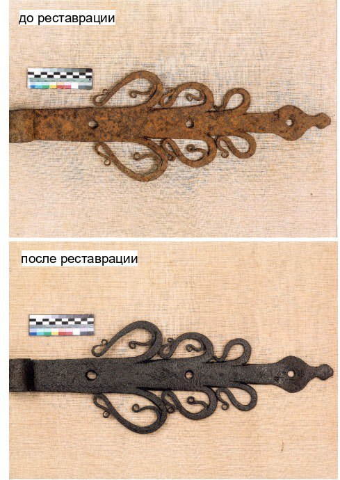 В процессе реставрации жиковины - кованной дверной петли - реставраторы обнаружили тонкий чеканный рисунок, созданный неизвестным мастером.