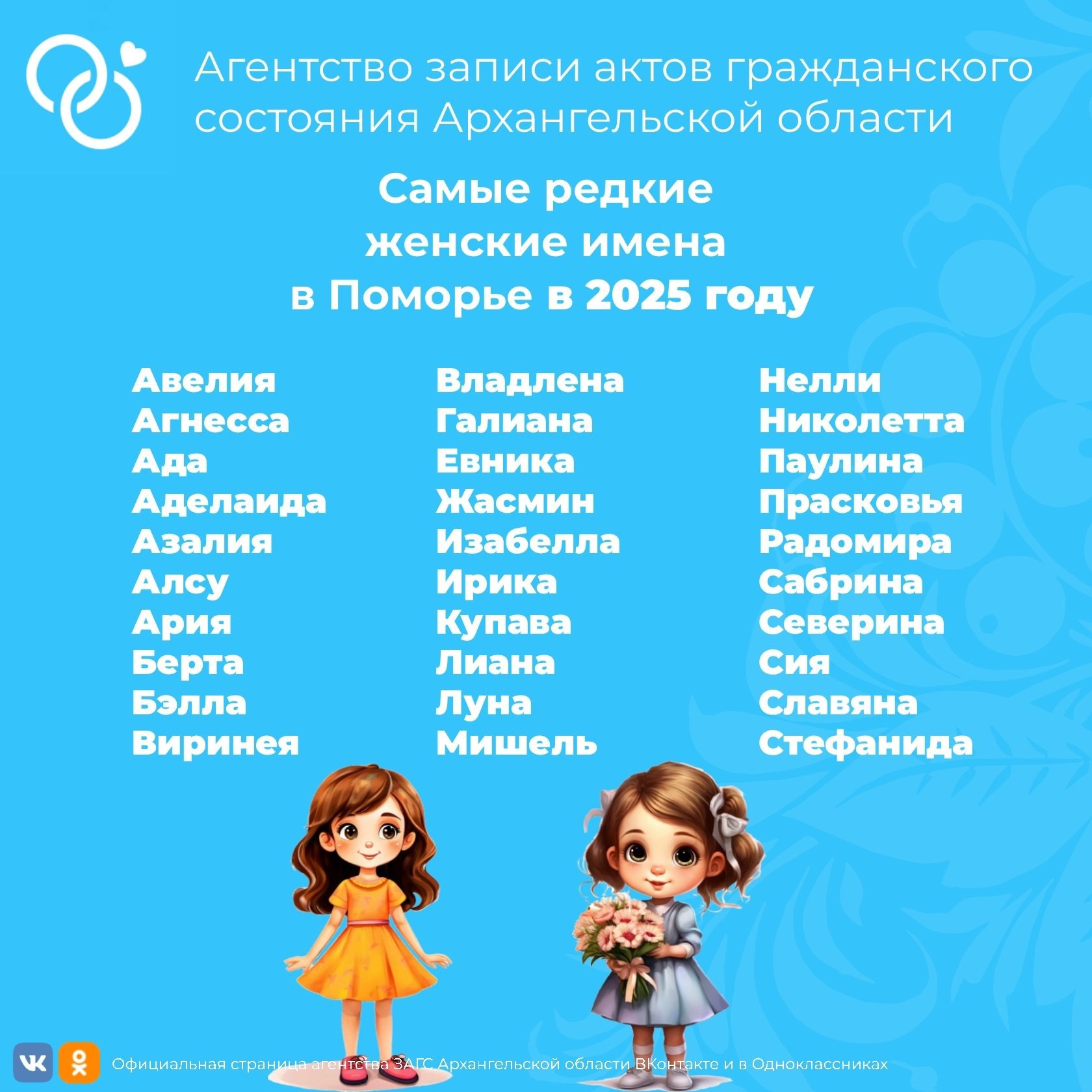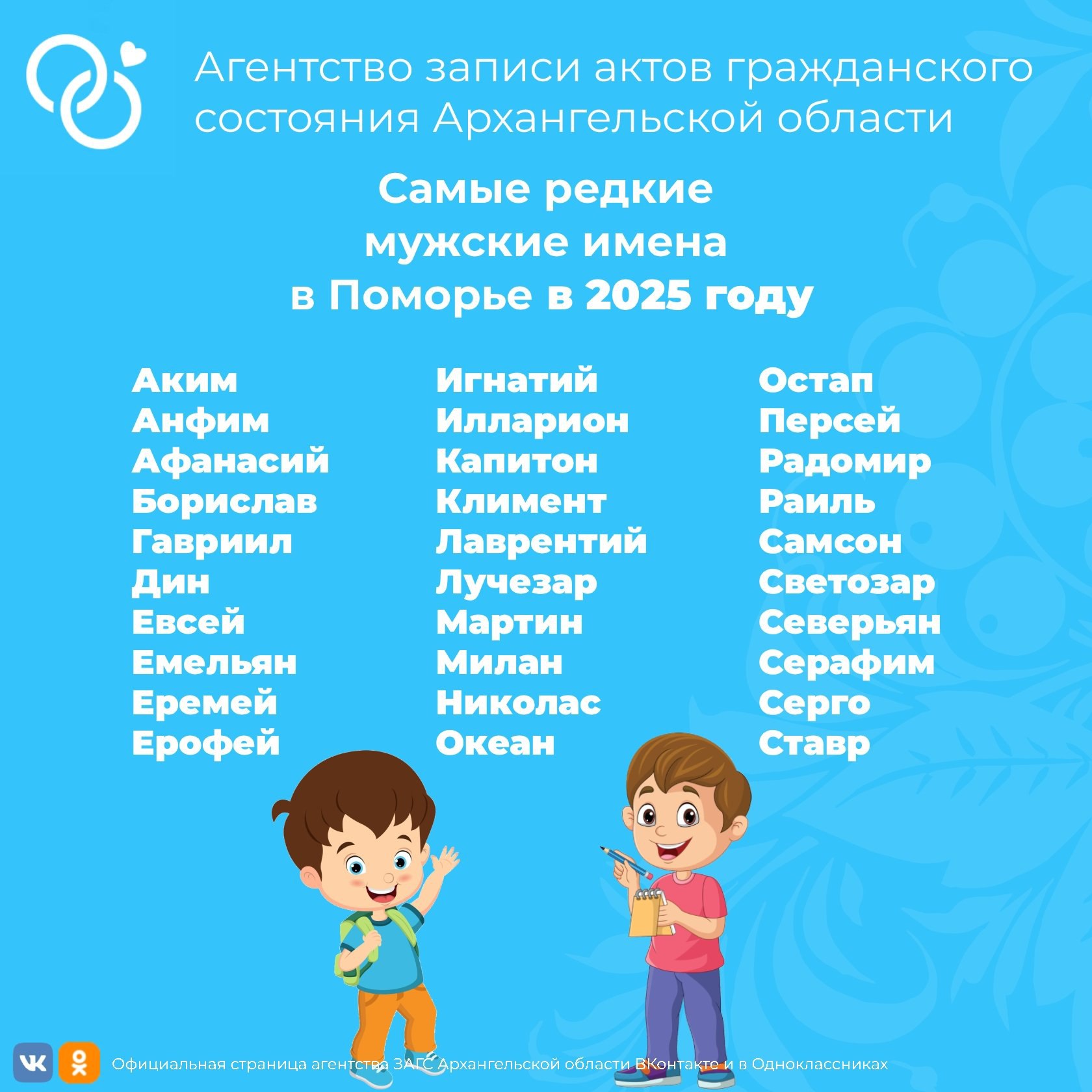 Агентство ЗАГС по Архангельской области поделилось интересной статистикой с самыми редкими мужскими и женскими именами в Поморье за 2025 год.Какое имя понравилось вам больше всего?
