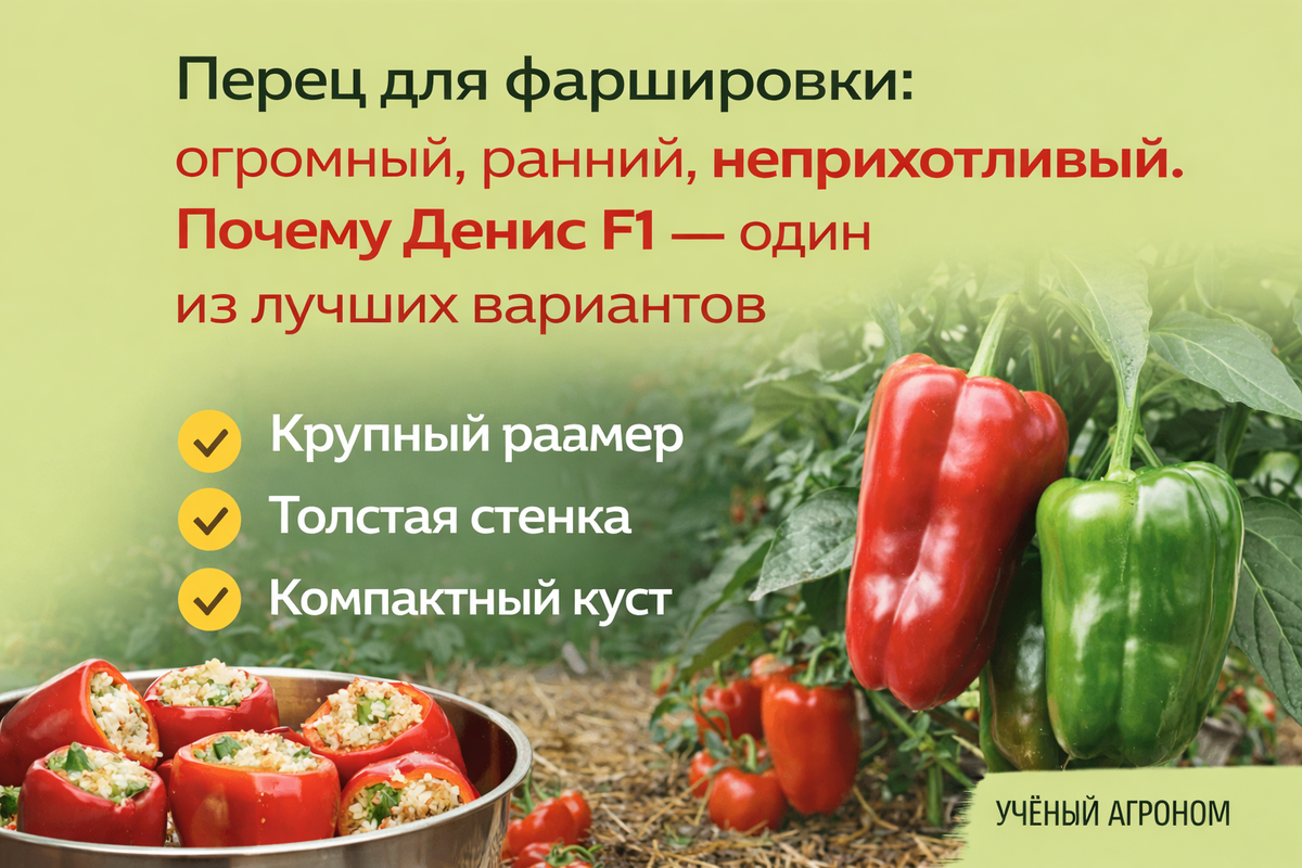 Сорт Денис F1 стал настоящим хитом среди дачников, которые ищут идеальные перцы для фаршировки. Этот раннеспелый гибрид обладает прекрасными характеристиками, подходящими для условий холодных регионов, что делает его одним из лучших выборов.