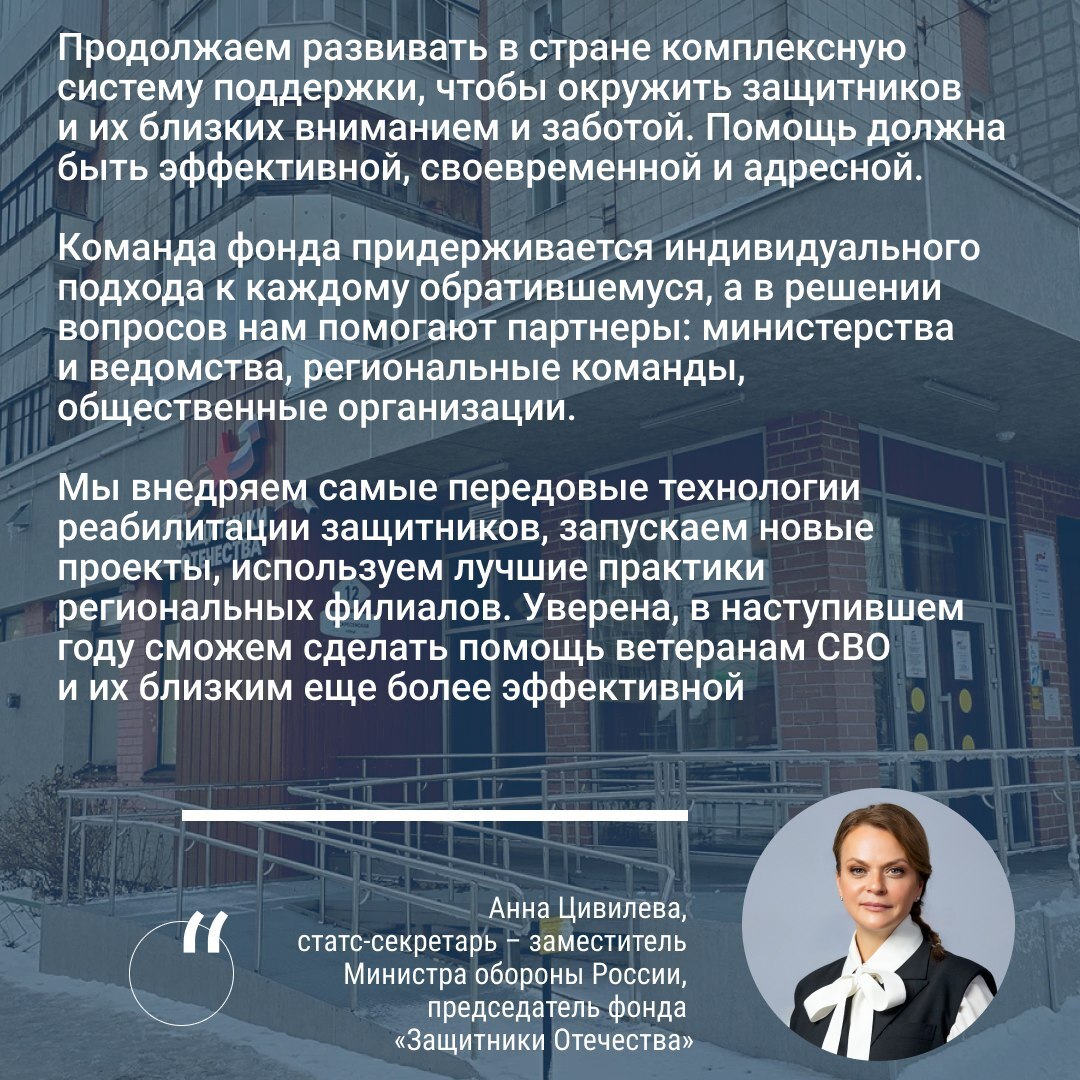— Продолжаем развивать в стране комплексную систему поддержки, чтобы окружить защитников и их близких вниманием и заботой. Помощь должна быть эффективной, своевременной и адресной. Команда фонда придерживается индивидуального подхода к каждому обратившемуся, а в решении вопросов нам помогают партнеры: министерства и ведомства, региональные команды, общественные организации. Мы внедряем самые передовые технологии реабилитации защитников, запускаем новые проекты, используем лучшие практики региональных филиалов. Уверена, в наступившем году сможем сделать помощь ветеранам СВО и их близким еще более эффективной, — отметила статс-секретарь – заместитель Министра обороны РФ, председатель Государственного фонда «Защитники Отечества» Анна Цивилева.