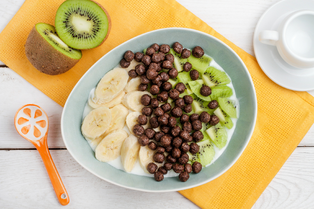 Основа — плотный кремовый йогурт, рядом — бананы и киви, нарезанные аккуратными кружками и дольками, чтобы в каждом кусочке ощущалась своя текстура. Небольшой шарик шоколада добавляет сладкую нотку, не перегружая вкус. Всё собирается за минуту и подаётся в тарелке или чашке так, как удобно на данный момент.