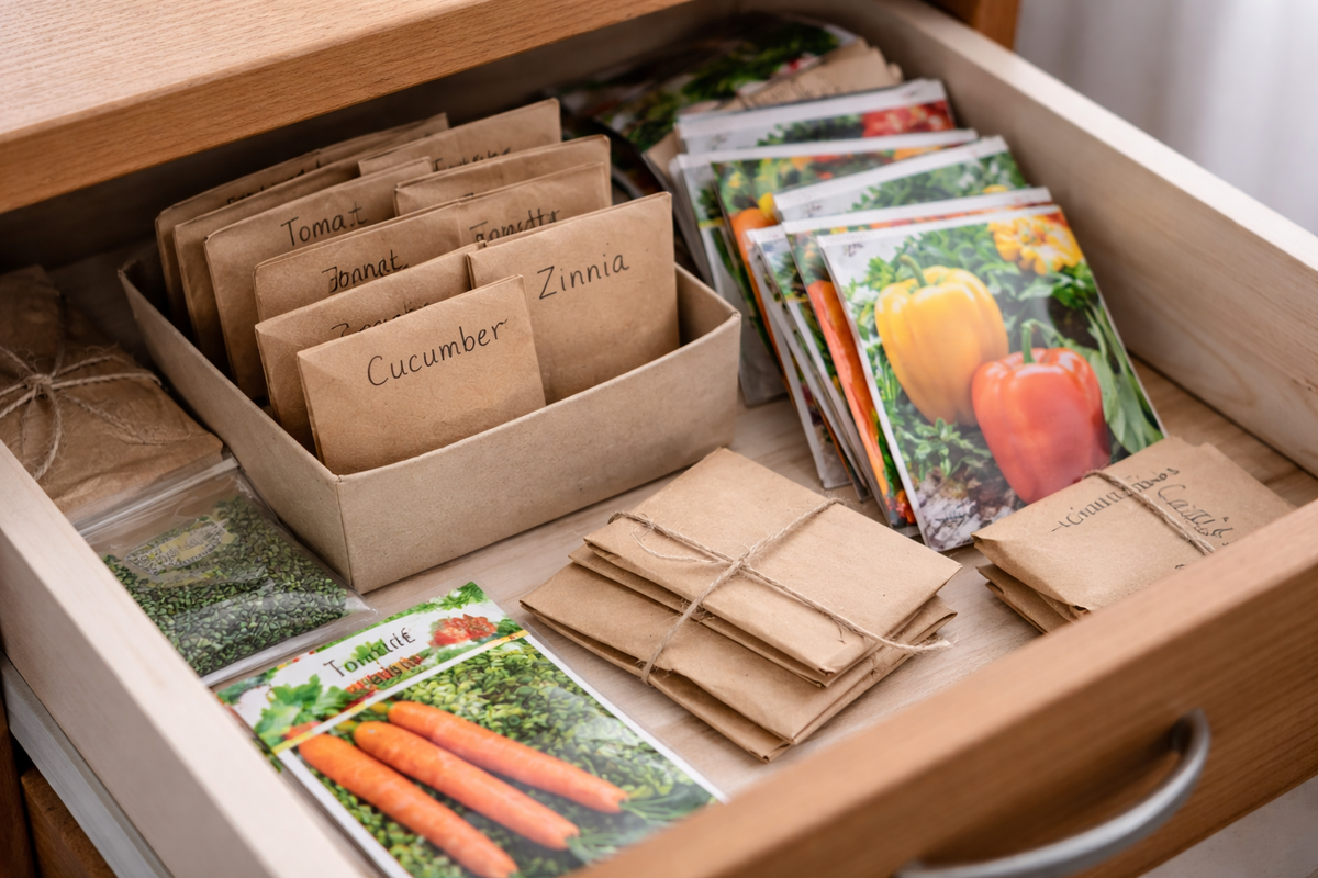 Семена чувствительны к колебаниям температуры. Они не любят охлаждать или нагреваться резкими скачками, поэтому стоит держать их вдали от кухонной зоны и батарей. Спокойная прохлада помогает сохранить энергию прорастания.