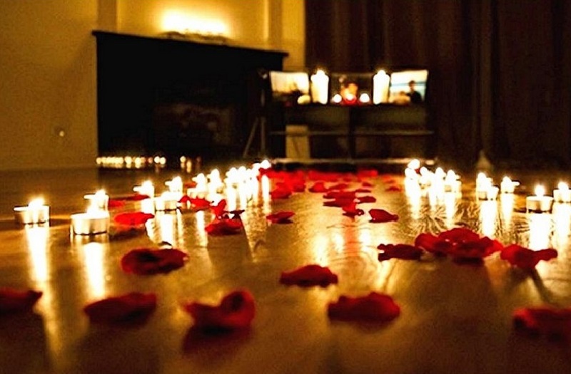 Главное — свет. Откажитесь от яркого основного освещения и добавьте свечи, которые можно grouping разместить на столе, подоконнике и вдоль пола. Теплое пламя создаёт интимность, а вариации форм свечей добавят настроение. Альтернатива — электрические свечи с мерцающим эффектом и мягкая гирлянда, которую можно повесить на стену, над дверью или вокруг зеркала.