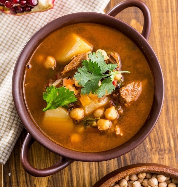 Бульон наваристый, мясо тает во рту, а курага, яблоко и гранат добавляют неожиданные ноты. Замоченный нут и мясо создают плотную основу, которая быстро согревает и дарит ощущение домашнего тепла.