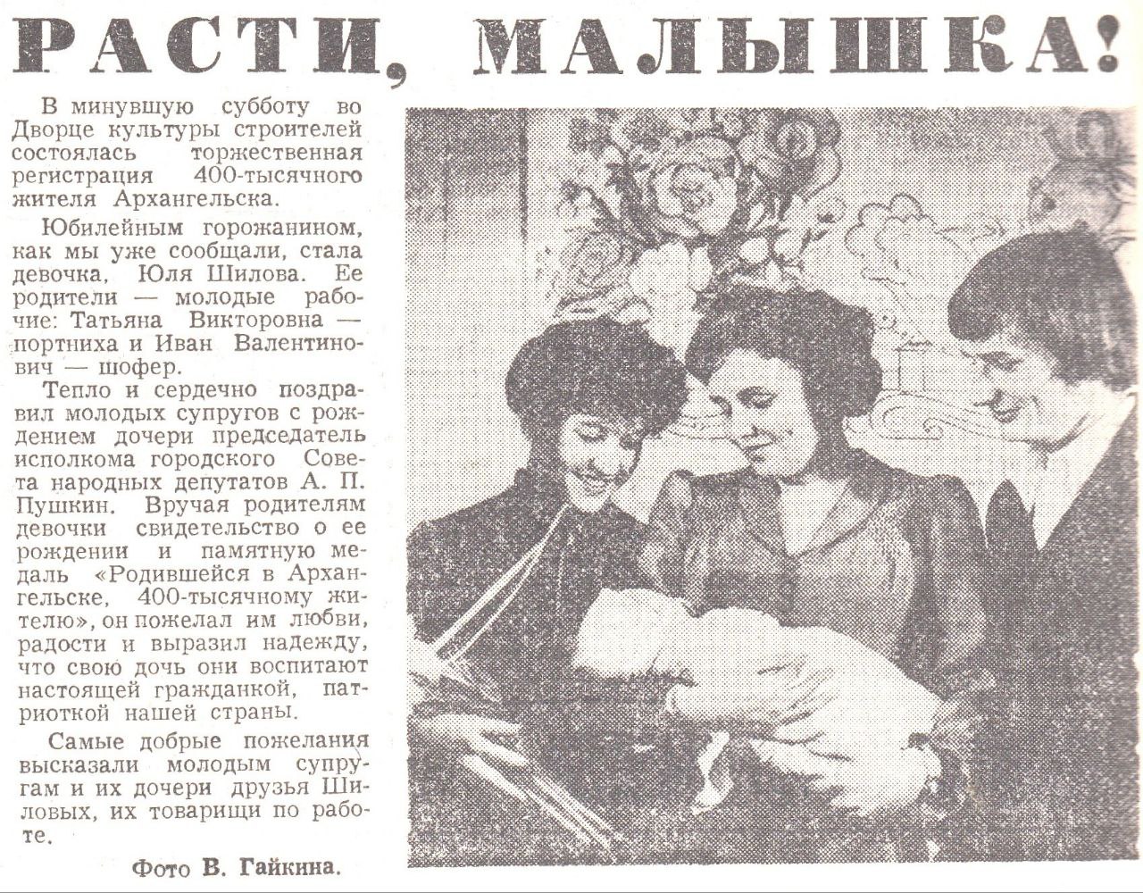 В архивах газет сохранились статьи о рождении в Архангельске 400-тысячного жителя. Случилось это событие 1 мая 1983 года.