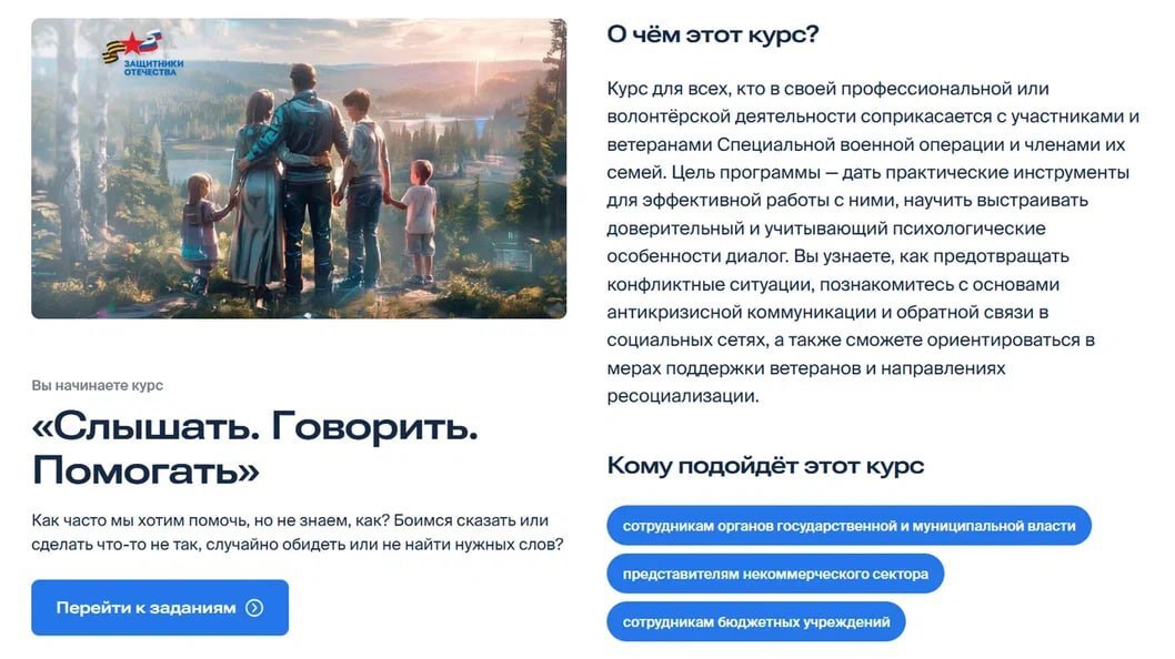 Ключевая цель курса систематизировать знания и дать практические инструменты для комплексной поддержки защитников и их близких. Среди основных тем: особенности взаимодействия с участниками СВО и членами их семей, помощь в получении мер поддержки, работа с информационными рисками, противодействие фейкам, реагирование на сложные запросы, разрешение конфликтных ситуаций.