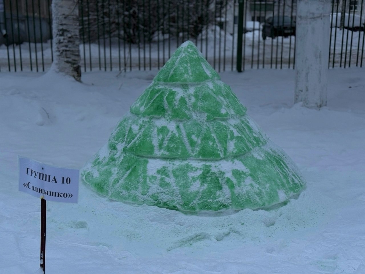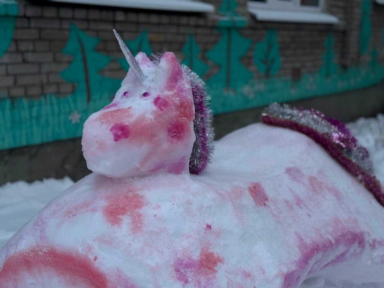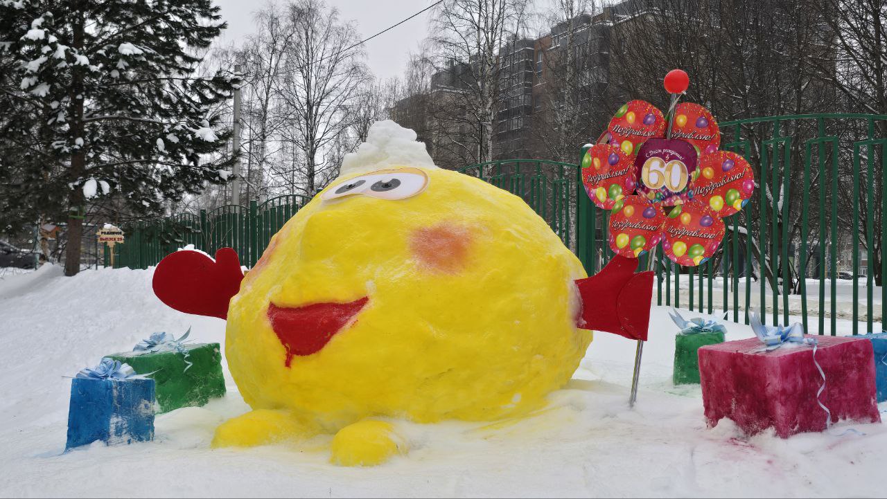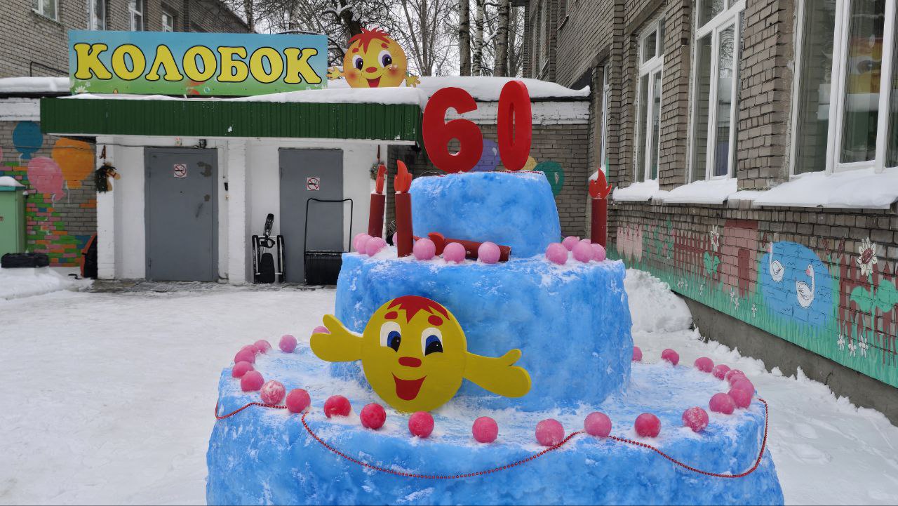 60 лет исполнилось детскому саду Колобок. В честь праздника они провели конкурс снежных фигур и теперь территорию украшают колобок, единорог и котик, большой торт и снежная ёлочка
