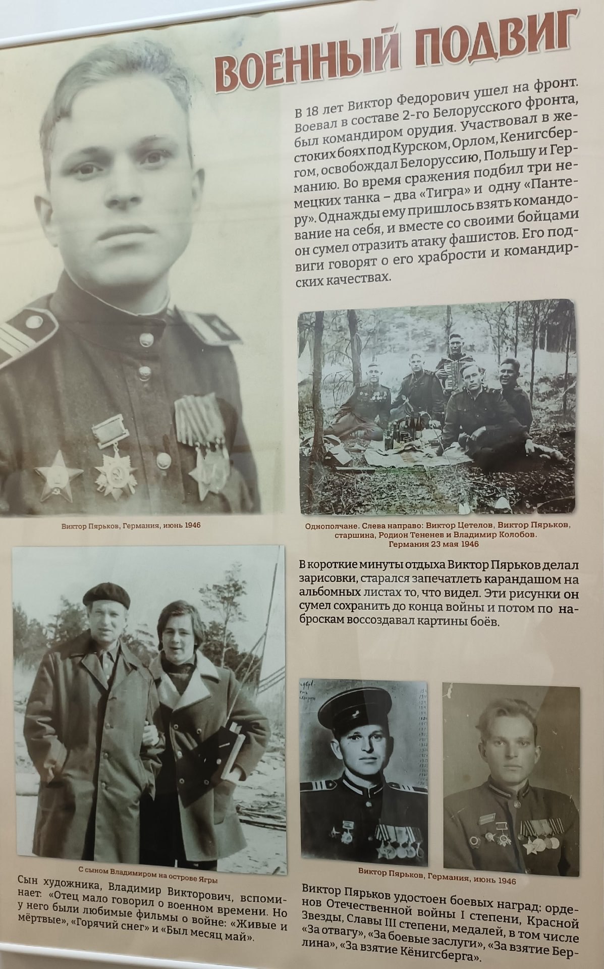 В минуты отдыха Виктор Пярьков делал зарисовки, на которых запечатлел то, что видел. Эти рисунки он сумел сохранить до конца войны, а потом воссоздал по наброскам.