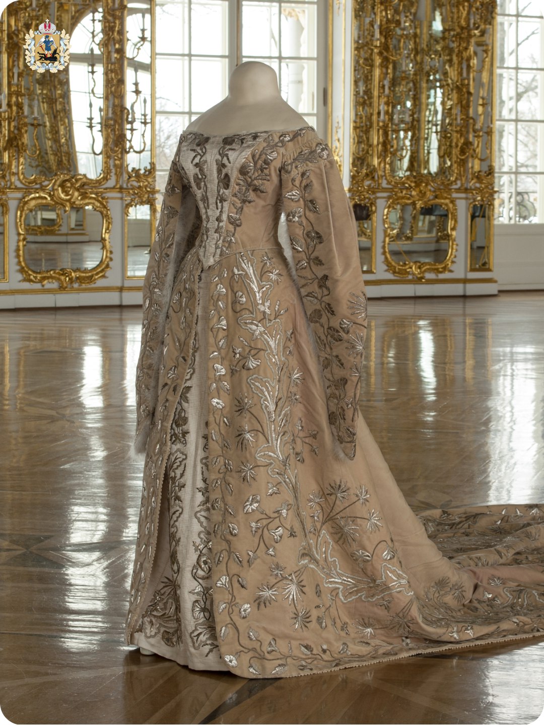 В залах Золотой анфилады посетителей ждёт встреча великокняжеских и фрейлинских платьев поставщиков императорского Двора с крестьянскими платками и кокошниками XIX века мастериц Русского Севера. На выставке представлено более 60 предметов из коллекций двух музеев.