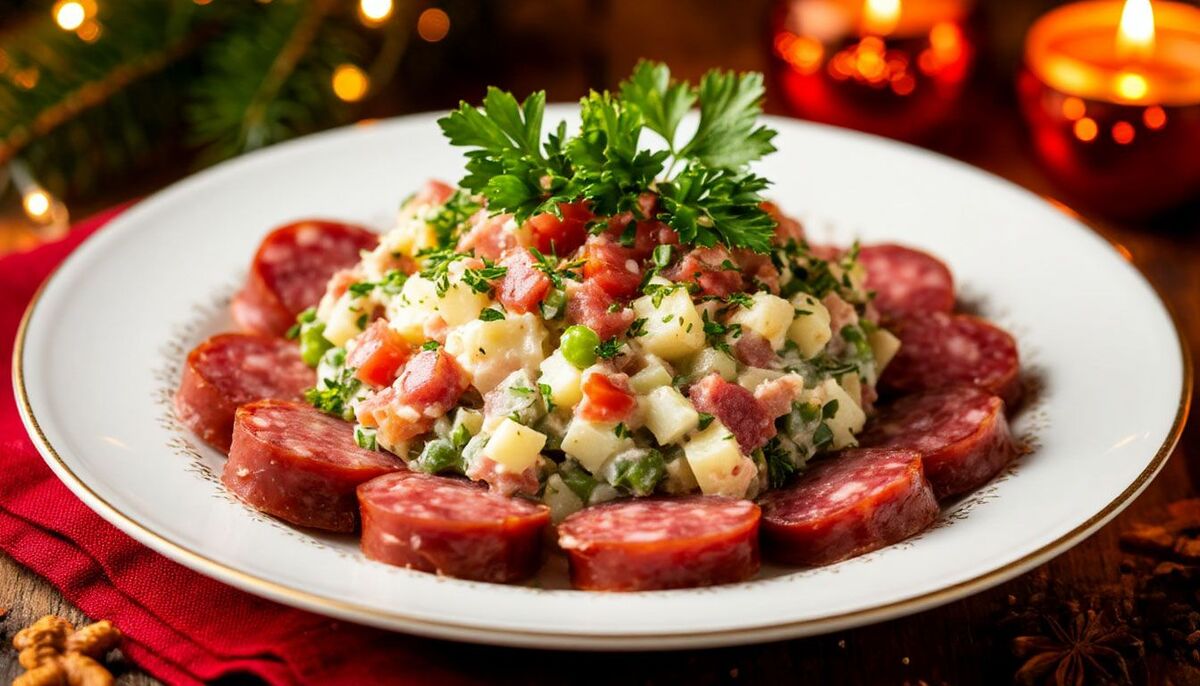 «Новый русский оливье» придумали в 90-е повара ресторанов для российских бизнесменов в малиновых пиджаках. Этот оливье стал символом изобильного праздничного стола с новыми, яркими вкусами. Он сочетает в себе классические ингредиенты и неожиданные нотки копчёной колбасы, буженины, свежего огурца и маринованного лука. Блюдо получается сытным, ароматным и очень праздничным — все гости просят добавки.