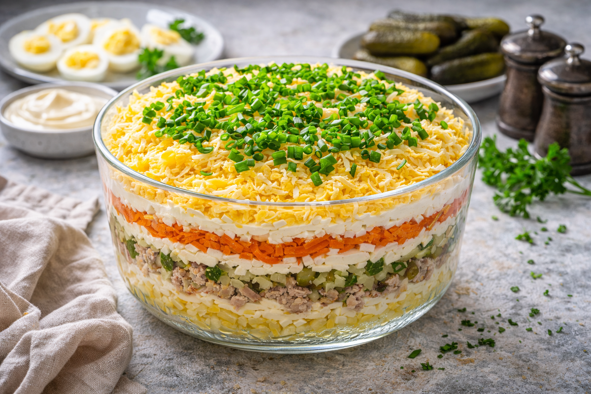 Как готовлю: картофель и морковь отвариваю заранее и полностью остужаю. В салатнице первым слоем выкладываю тёртый картофель, слегка подсаливаю и смазываю майонезом. Далее идёт печень трески — её достаточно просто размять вилкой и распределить ровным слоем. Следом — солёные огурцы, натёртые на крупной тёрке и хорошо отжатые от лишнего сока. Потом слой тёртых яиц с тонкой сеткой майонеза. Далее выкладываю морковь, а завершаю салат тёртым сыром. Сверху — щедрая горсть рубленого зелёного лука, пишет PopCornNews.