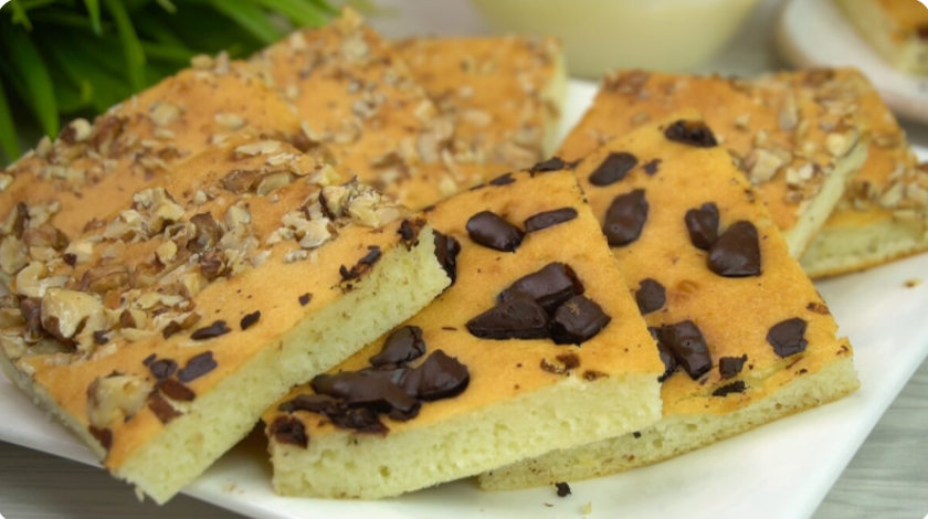 На противень, застеленный бумагой для выпечки, выложите тесто, посыпьте орехами, шоколадом или фруктами, а затем поставьте в разогретую до 180°C духовку. Выпекайте примерно 20 минут.