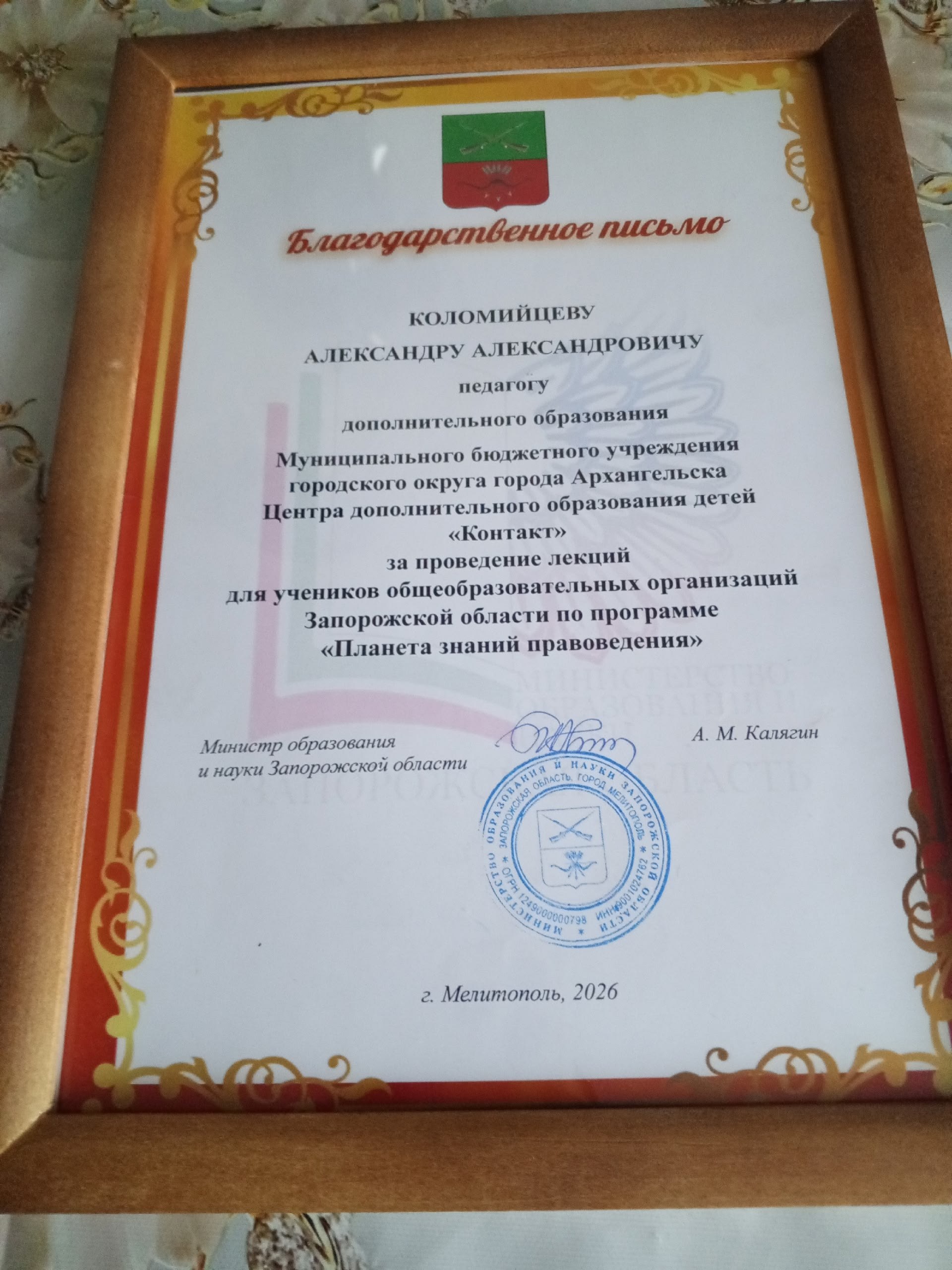 Жители столицы Поморья не только направляют в Мелитополь гуманитарную помощь, но и делятся знаниями. Так, педагог архангельского центра «Контакт», секретарь первичного отделения Единой России №104 Александр Коломийцев посетил Мелитопольскую среднюю школу №1, где провёл лекции по правовому воспитанию подростков.
