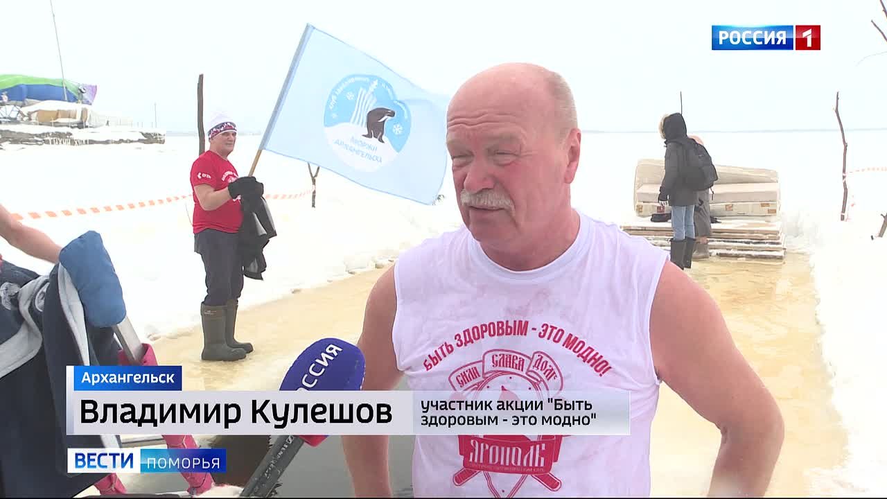 На берегу Северной Двины жители Поморья обливались ледяной водой. Цвета футболок и вёдер символизировали российский триколор. Среди участников — активисты из клуба закаливания «Моржи Архангельска».