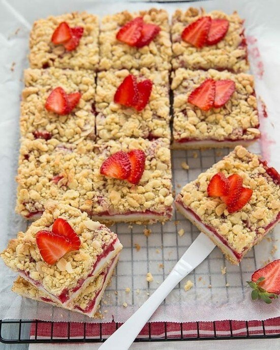 Сборка пирога: Выложить половину крошки в форму, покрытую пергаментом. На нее вылить охладившийся крем, затем аккуратно распределить клубничную начинку. Посыпать оставшейся крошкой и миндалем (если используете).