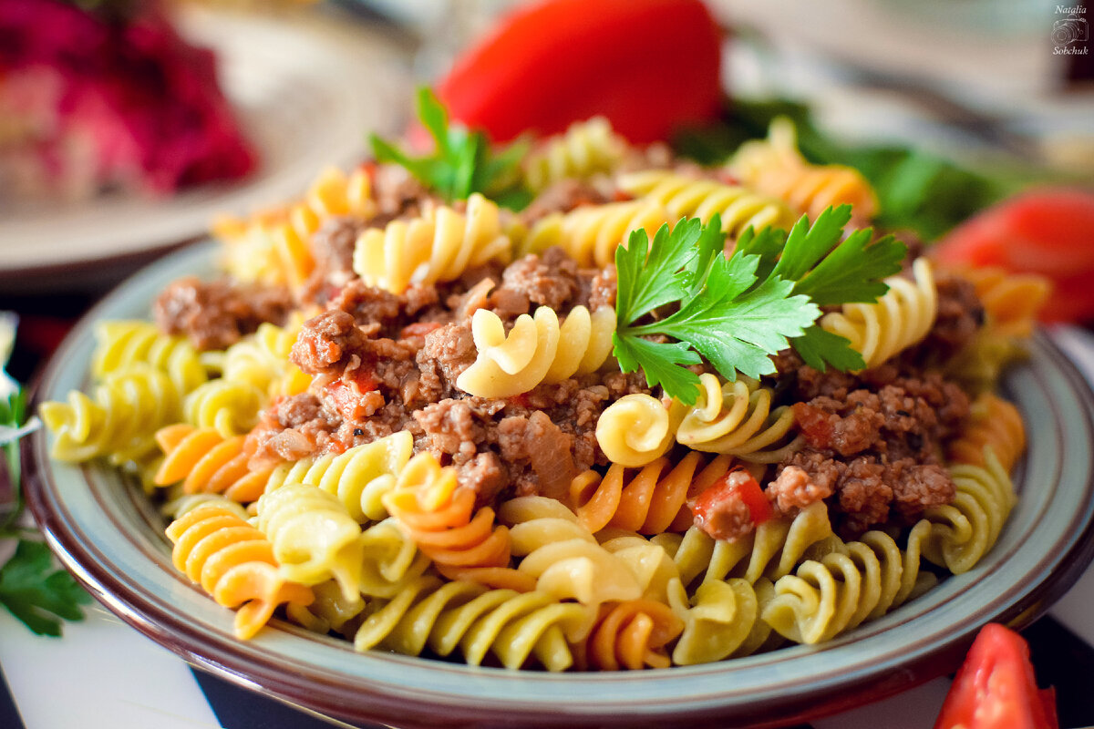 Отварите макароны в подсоленной воде до состояния «al dente». Затем аккуратно смешайте готовые макароны с фаршем, чтобы соус равномерно распределился.