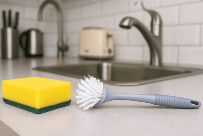 - Идеальный вариант: использовать их поочередно. Например, счистить остатки пищи щёткой, а потом быстро пройтись губкой перед ополаскиванием.