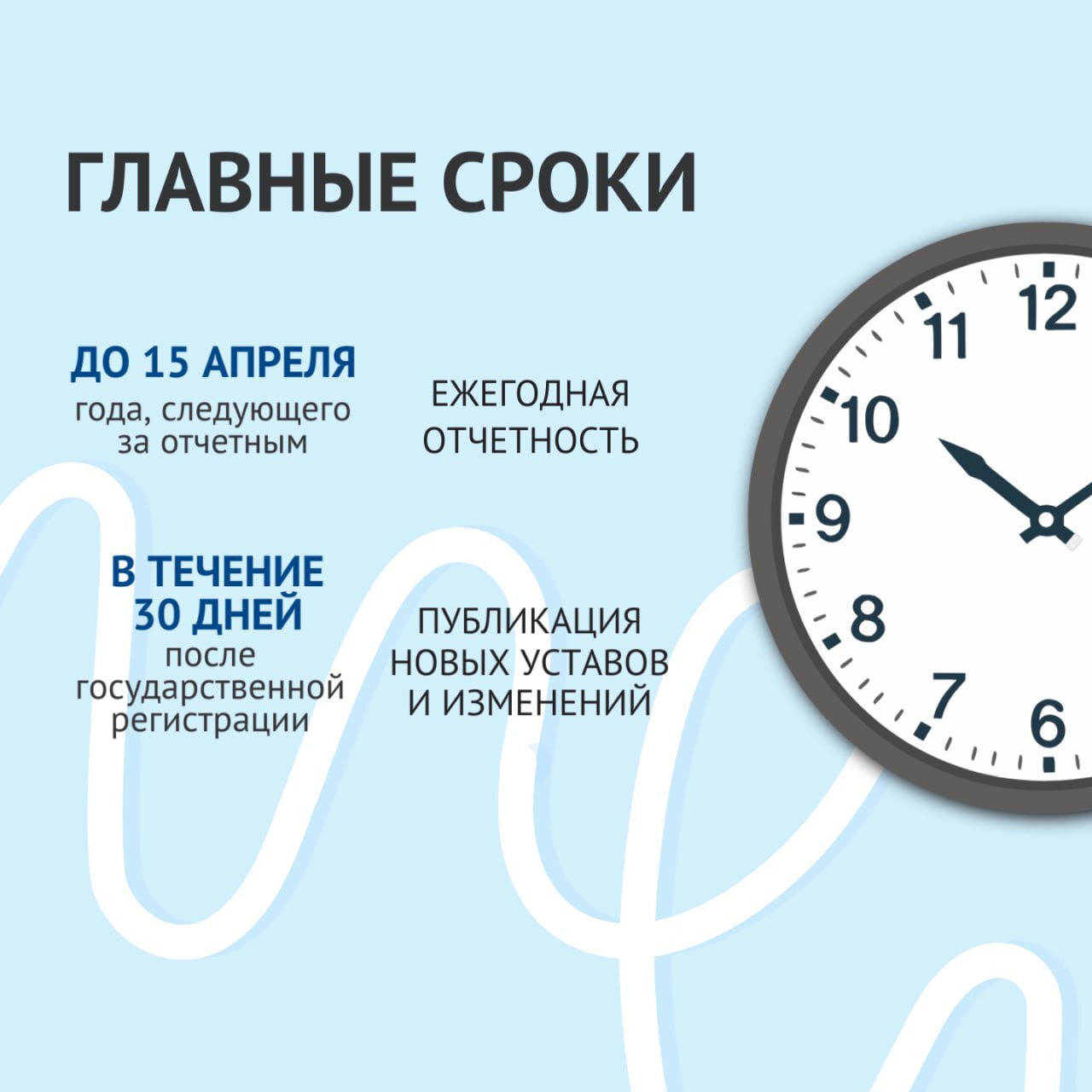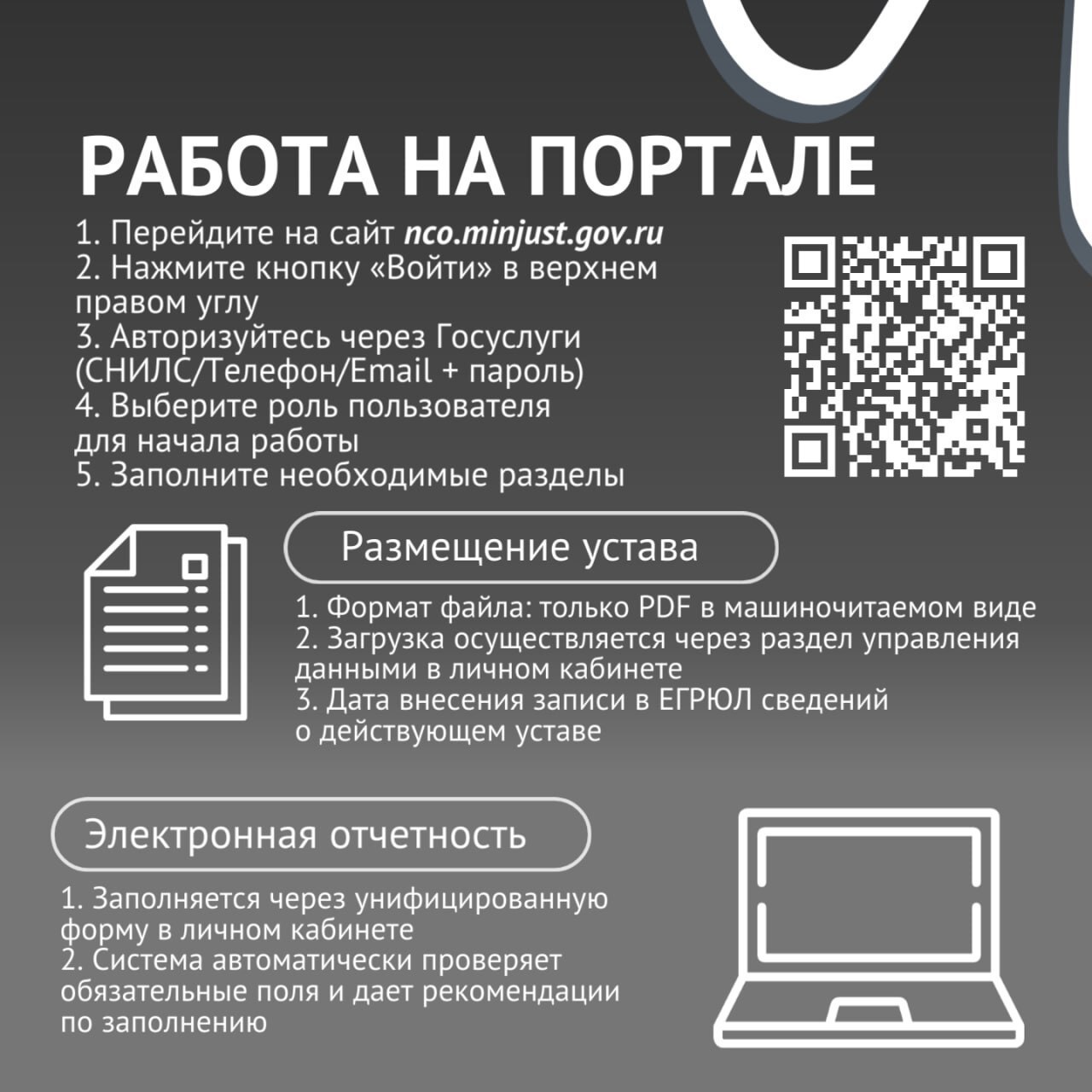 Через портал НКО размещают устав (в течение 30 дней после регистрации или внесения изменений, а также в установленные сроки для уже действующих организаций) и ежегодно, не позднее 15 апреля, заполняют и публикуют отчётность по установленной форме. Часть данных подставляется автоматически из сведений Минюста.
