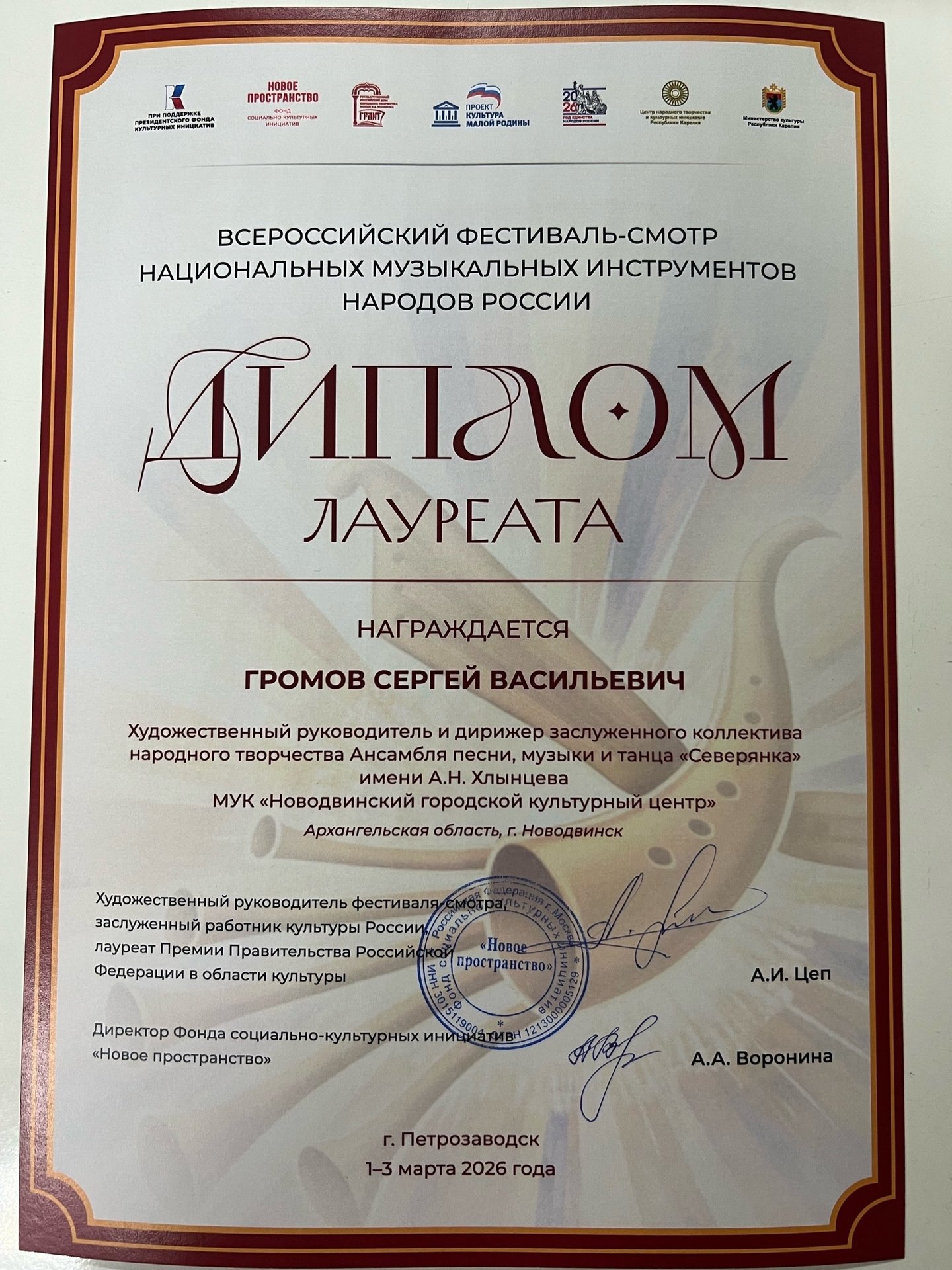 Художественный руководитель и дирижёр народного ансамбля песни, музыки и танца «Северянка» им. А.Н. Хлынцева — Сергей Васильевич Громов — стал Лауреатом Всероссийского фестиваля-смотра национальных музыкальных инструментов народов России