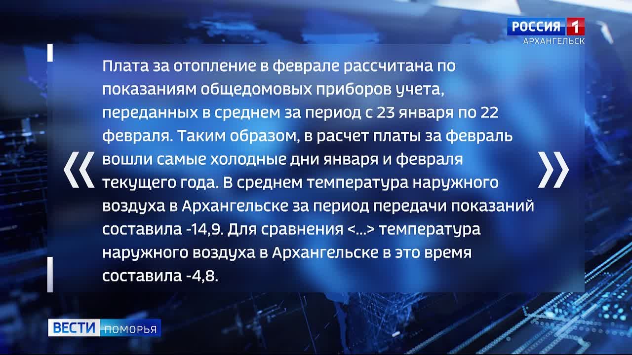 В начале этого года северянам стали приходить квитанции с увеличенной суммой за коммунальную услугу. Отмечено, что начисления в жилых домах выполняют по установленным тарифам в соответствии с показаниями общедомовых приборов учёта или по нормативу при их отсутствии. Для Архангельской области тариф на тепловую энергию и на горячую воду составляет 2 тысячи 756 рублей 19 копеек за гигакалорию. При этом расход тепла зависит от температуры наружного воздуха. Чем холоднее, тем больше его потребуется.