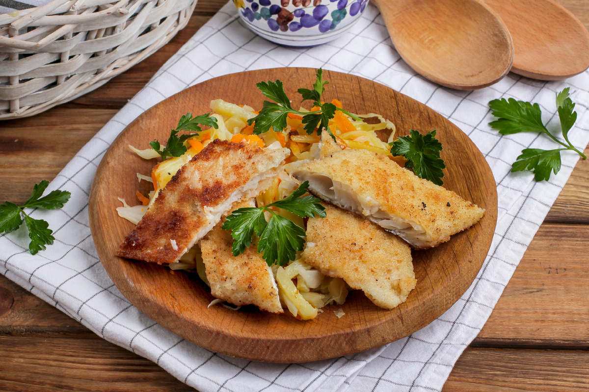 Шаг 4: Разогрейте сковороду с 1 ст. ложкой растительного масла. Обваляйте рыбу сначала в муке, затем обмакните в яйце и обваляйте в сухарях. Обжаривайте хека по 3-4 минуты с каждой стороны на среднем огне. Подавайте рыбу на подушке из овощей сразу после приготовления.