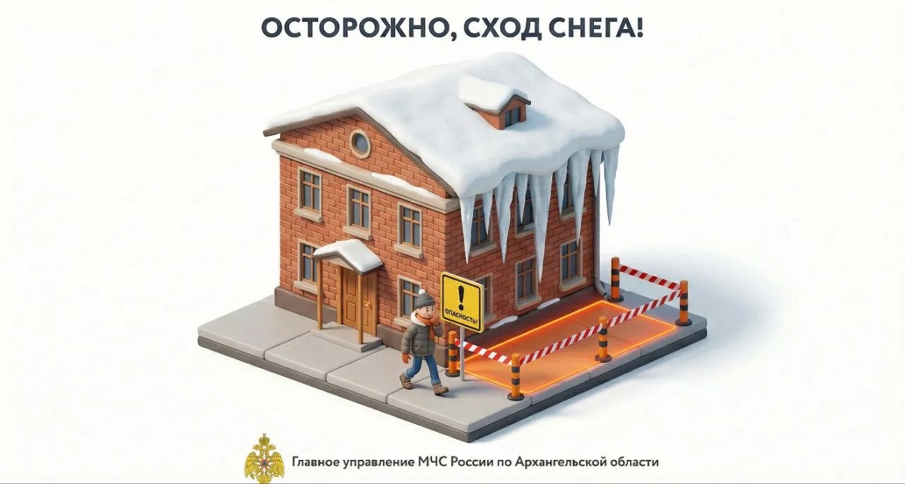 Главное управление МЧС России по Архангельской области предупреждает: нависающий снег и сосульки на крышах представляют опасность для пешеходов.